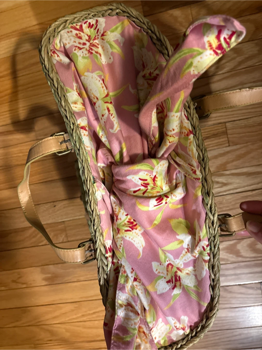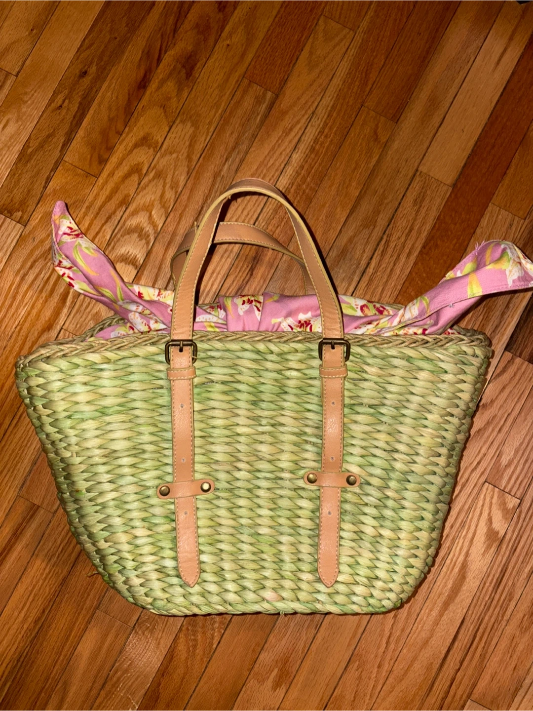 A charming woven straw tote bag featuring a light green exterior. It has faux leather straps and buckle details. The interior lining is a vibrant pink with a white and yellow floral print. It's perfect for summer outings!