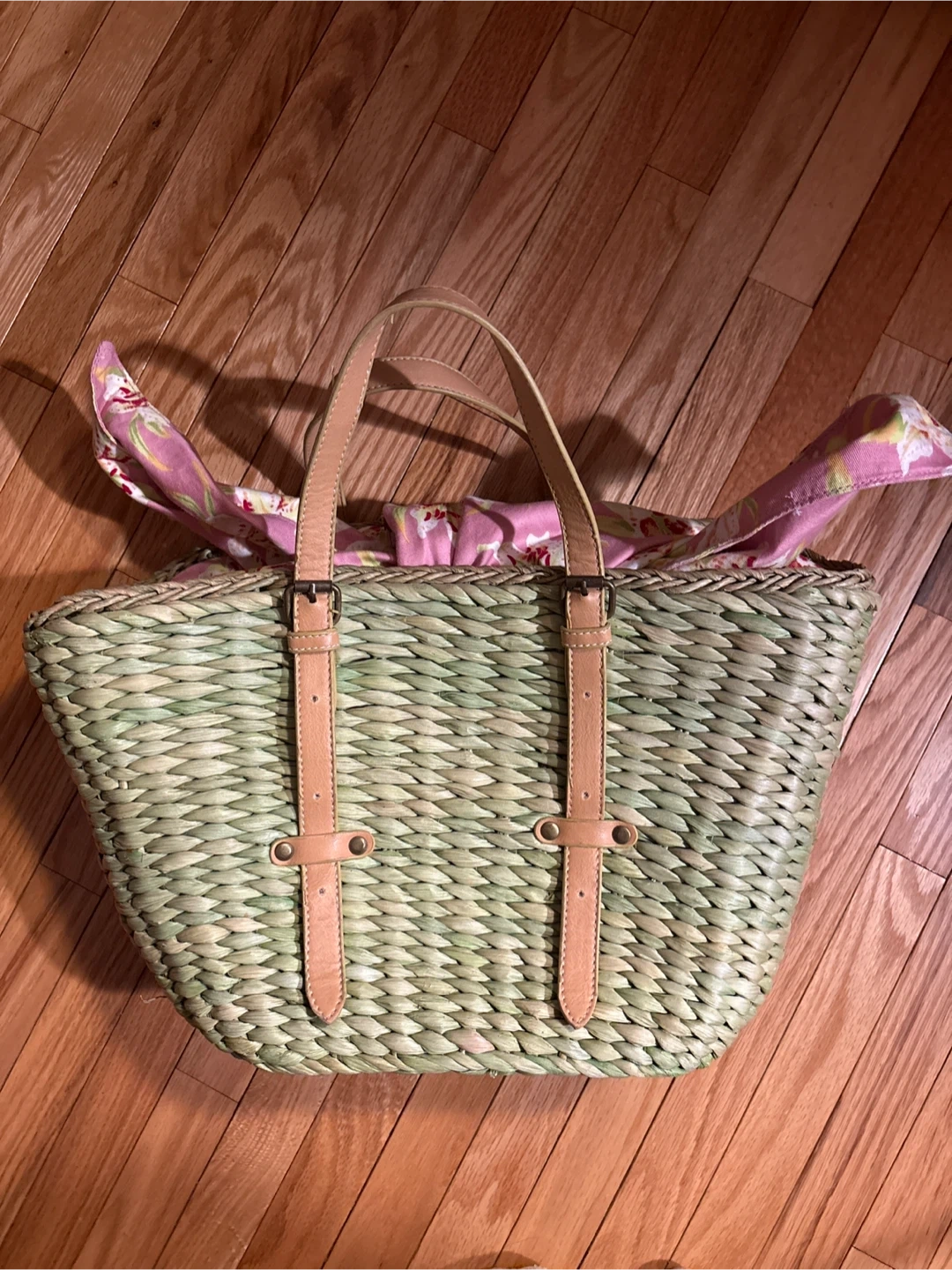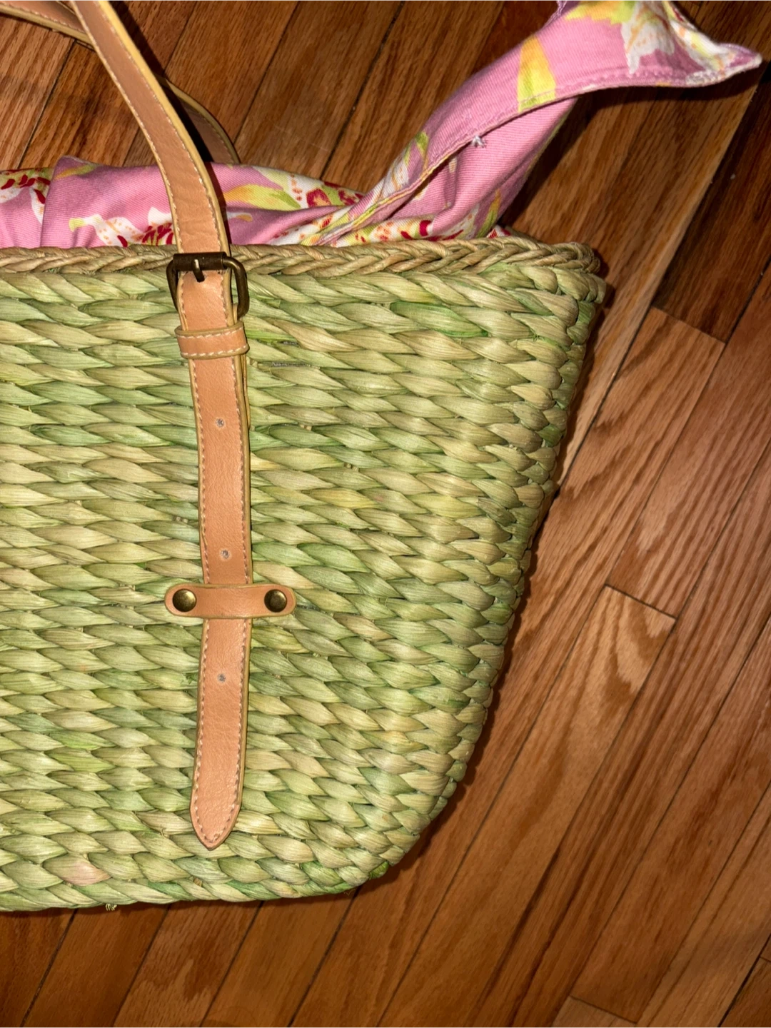 A charming woven straw tote bag featuring a light green exterior. It has faux leather straps and buckle details. The interior lining is a vibrant pink with a white and yellow floral print. It's perfect for summer outings!