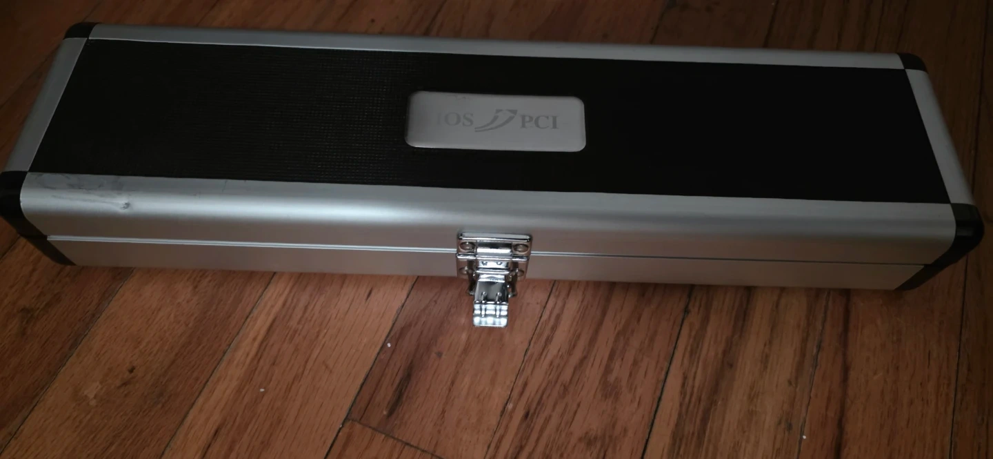 This is a JOS PCI carving set. It includes a carving fork and a slicing knife. Both pieces are made of stainless steel. The set comes in a silver and black aluminum case.