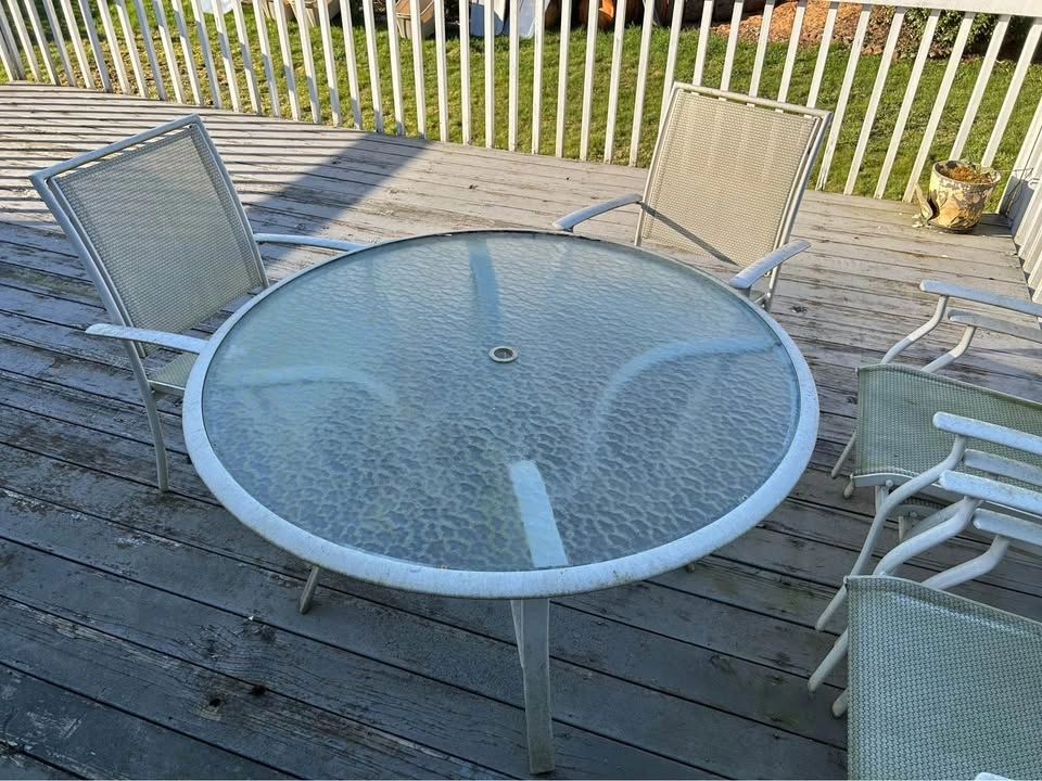 Round glass top 4’ wide table and 6 chairs set. Can be wiped clean. Does not wobble. Pick up near 120st and 82ave in north Delta near Surrey. Please purchase whole set and NO haggling.