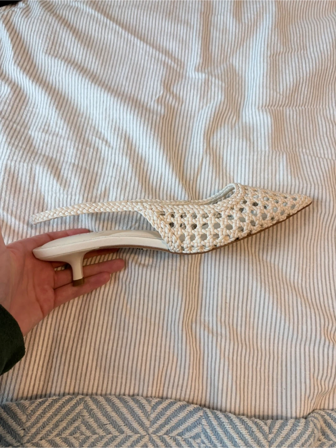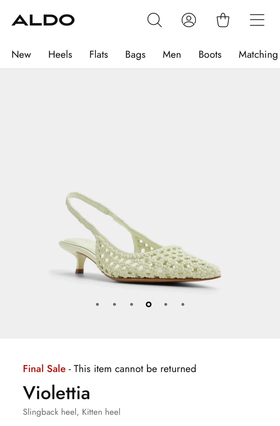 ALDO Violettia slingback kitten heels with a woven detail. These shoes are made with a synthetic sole and upper material. They offer a stylish and comfortable option for everyday wear. Cream colour sold out in stores!