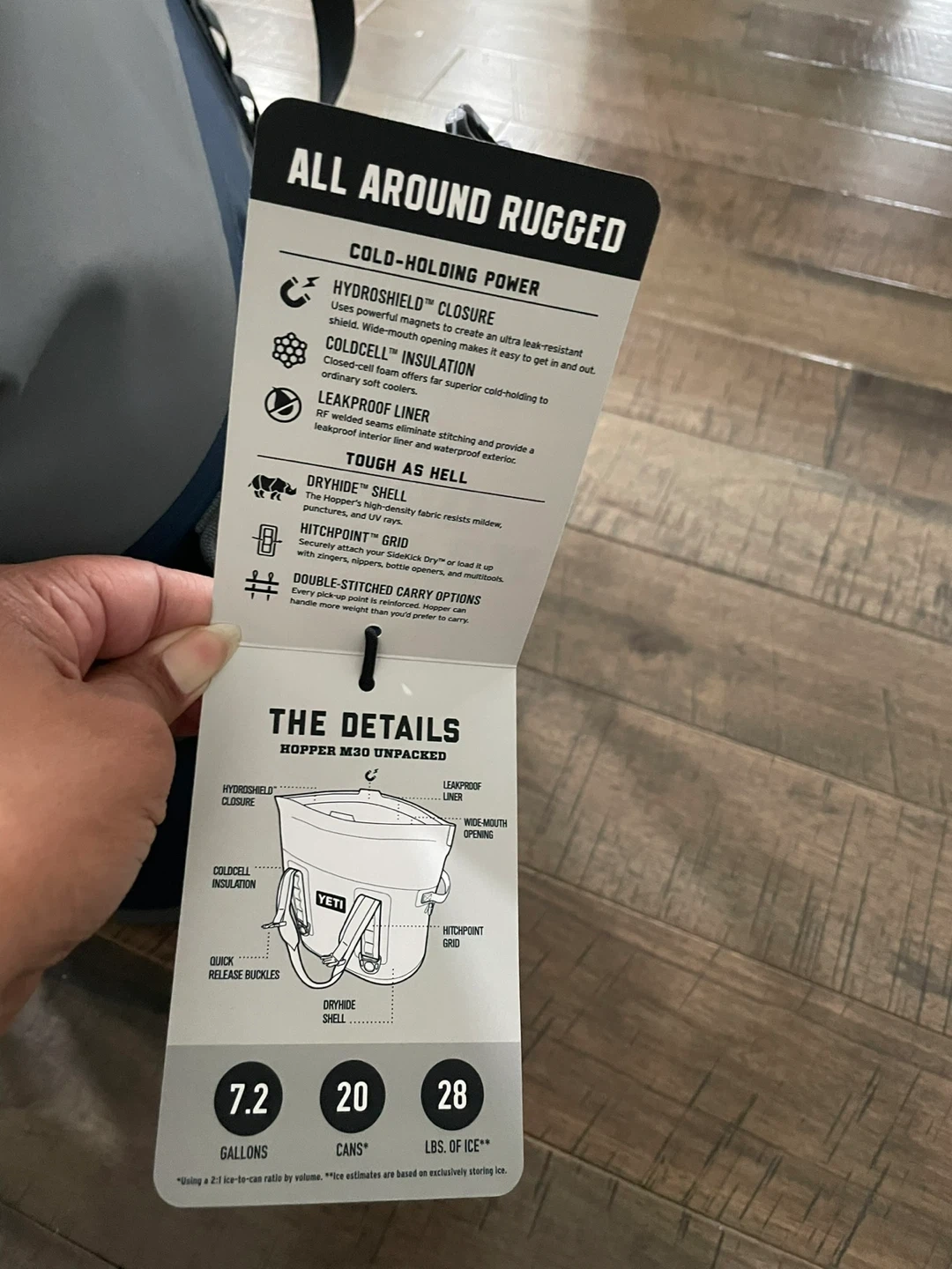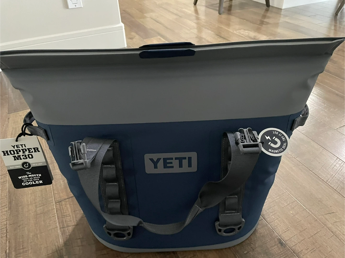 33Keep your drinks and snacks cold with this YETI Hopper M30 soft cooler! It's in great shape and ready for your next adventure. - Navy colour - Features a HydroShield closure that uses magnets to create an ultra leak-resistant shield - Coldcell insulation offers superior cold-holding to ordinary soft coolers - Leakproof liner - Tough DryHide shell resists mildew, punctures, and UV rays - Hitchpoint grid for accessories - Double-stitched carry options - Holds 7.2 gallons, or 20 cans