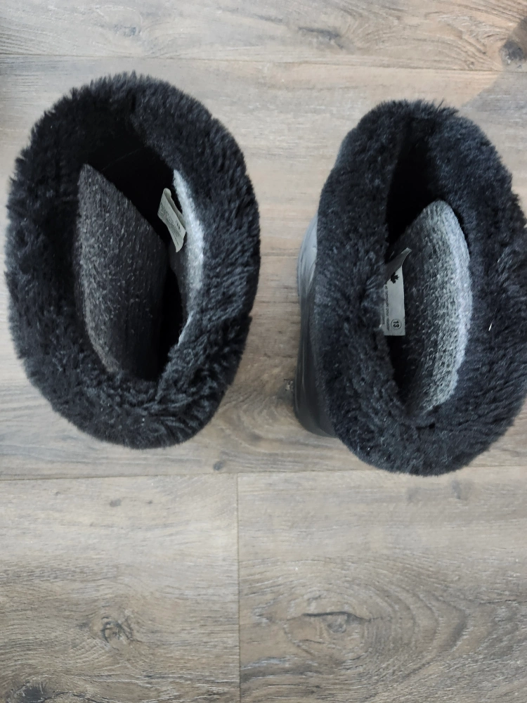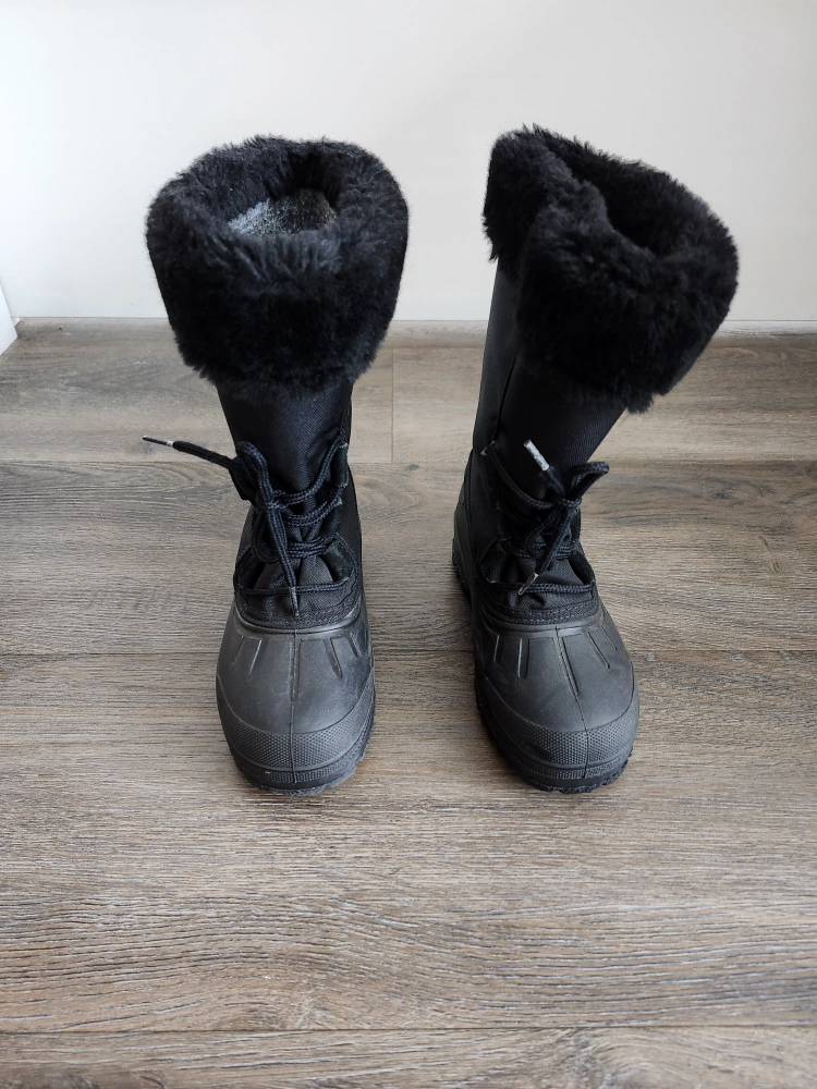 Lightly worn Yeti black snow boots. Faux fur trim. Felt inner layer for warmth. Lace-up closure. Waterproof outer shell. Great for winter weather.