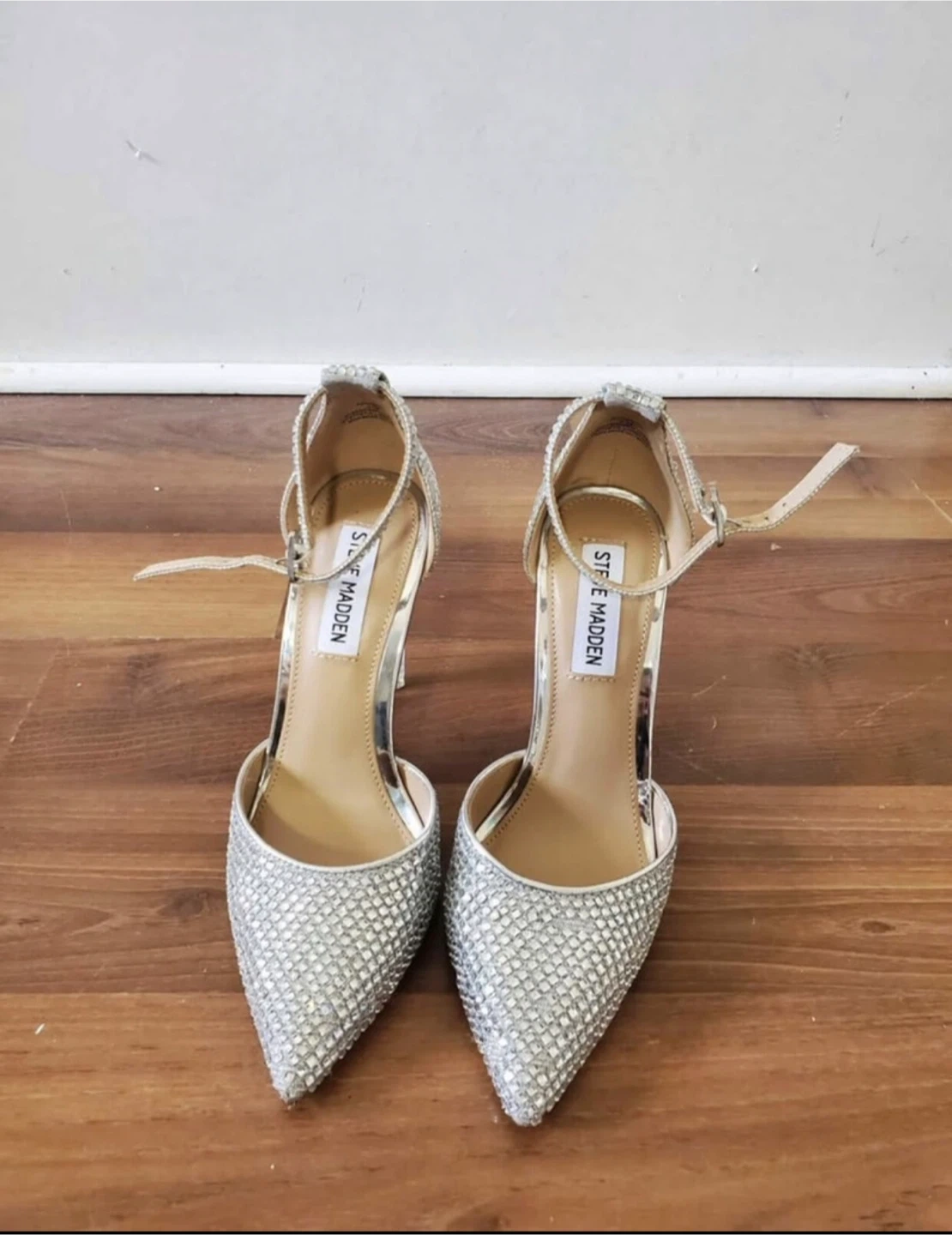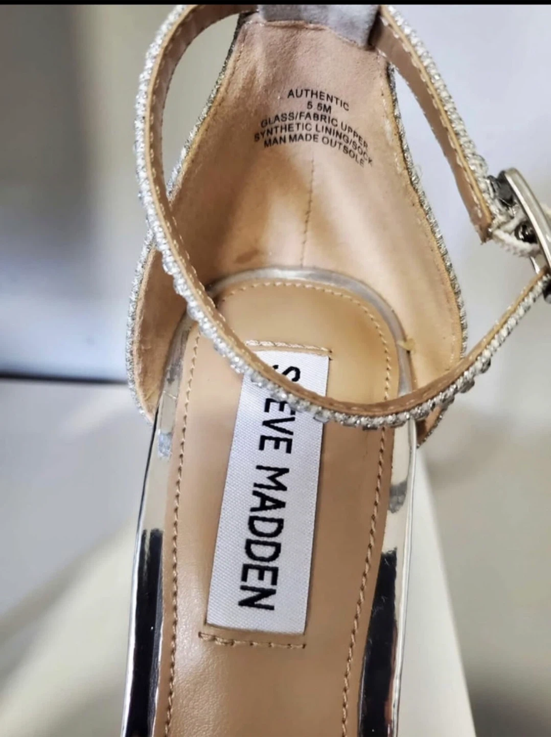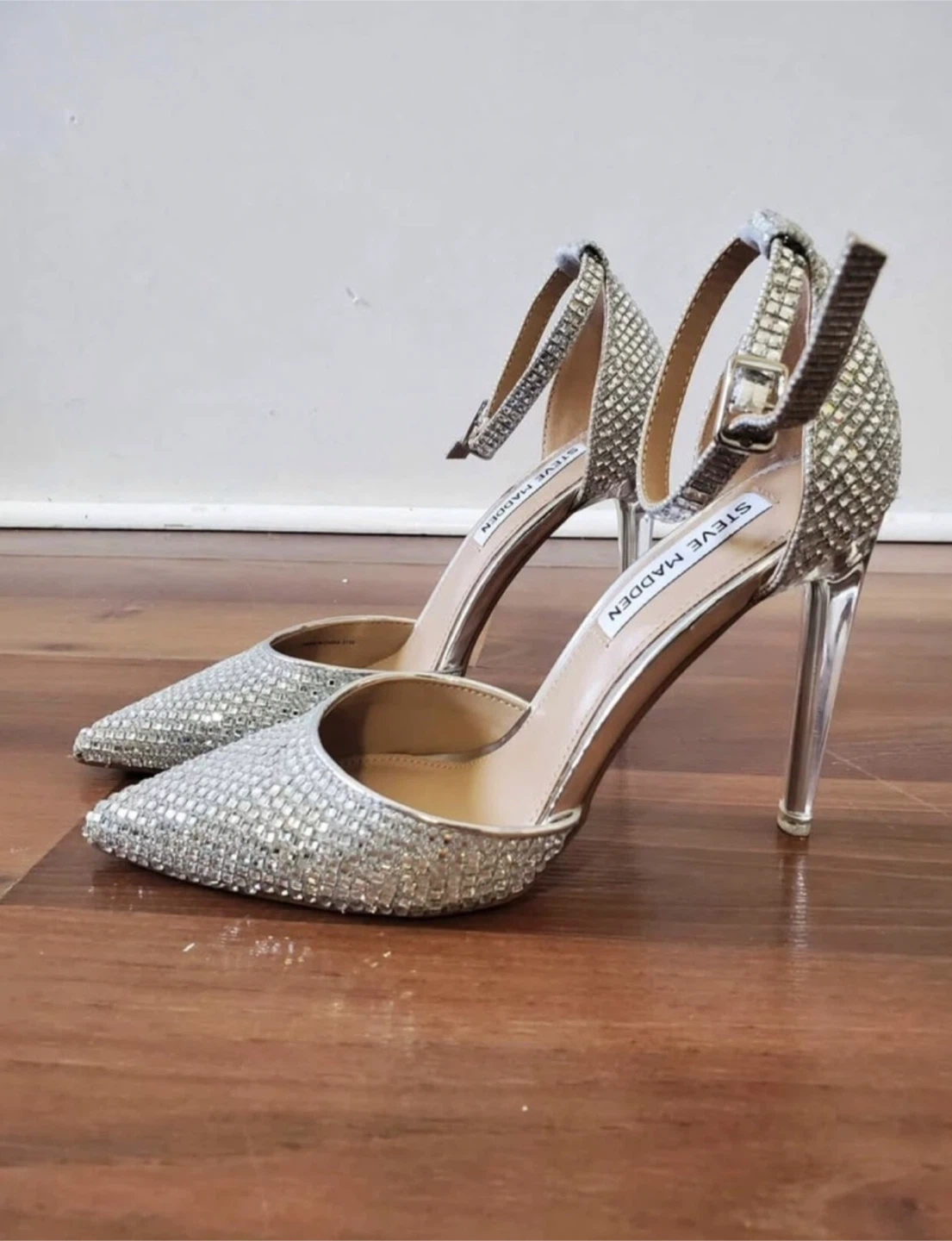 Worn only 1 time, Sparkly silver heels by Steve Madden. Features a synthetic upper with rhinestone embellishments and a clear block heel. Includes an ankle strap for a secure fit.