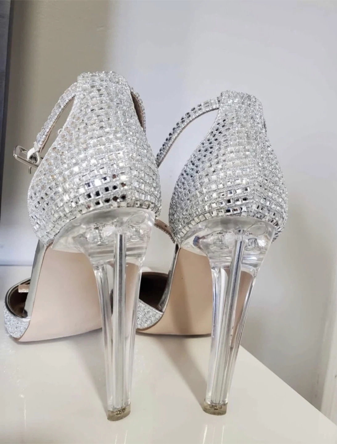 Worn only 1 time, Sparkly silver heels by Steve Madden. Features a synthetic upper with rhinestone embellishments and a clear block heel. Includes an ankle strap for a secure fit.