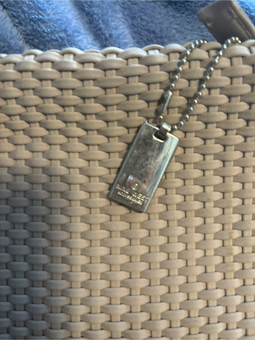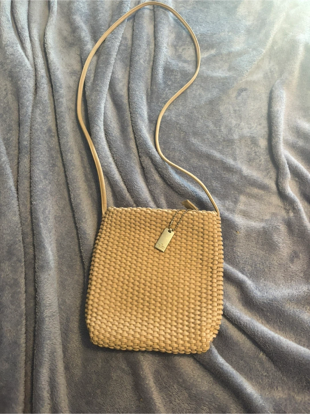 A woven crossbody bag from Nine West. It features a light tan colour and a simple, elegant design. Perfect for carrying essentials on the go!