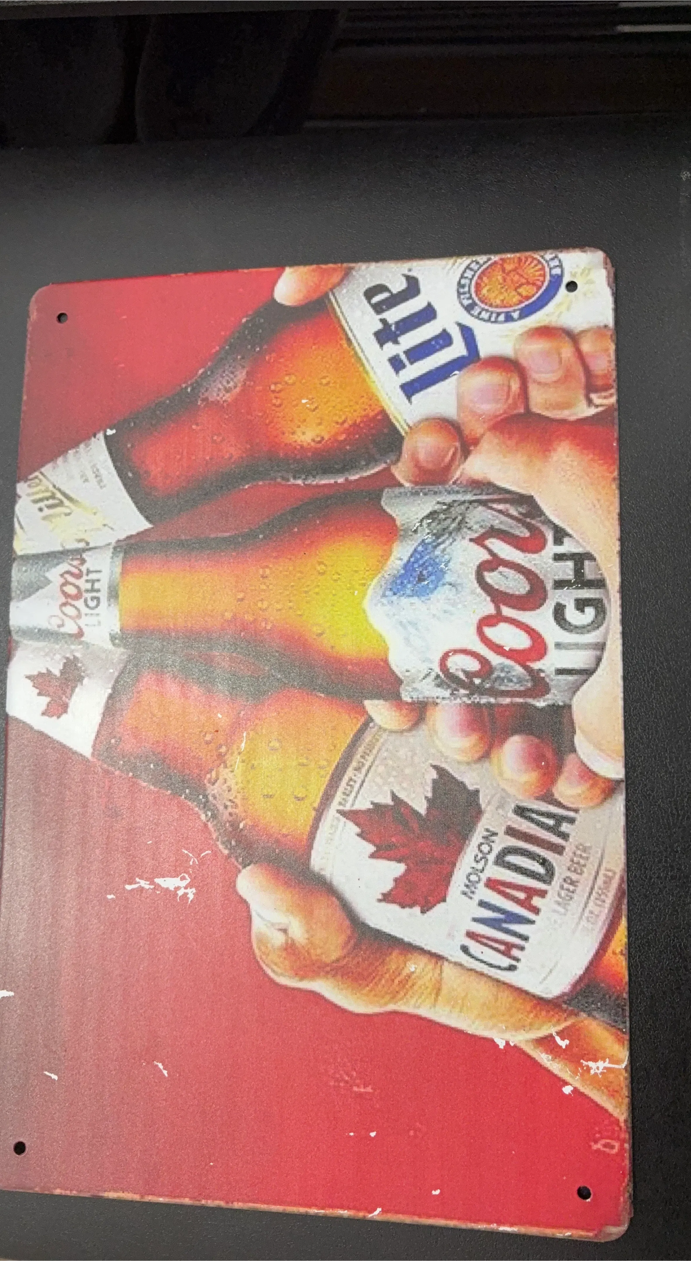 This metal sign features Coors Light and Molson Canadian beer bottles. It's a cool piece for any bar or man cave. Sign has a few minor scuffs but is otherwise in good condition.