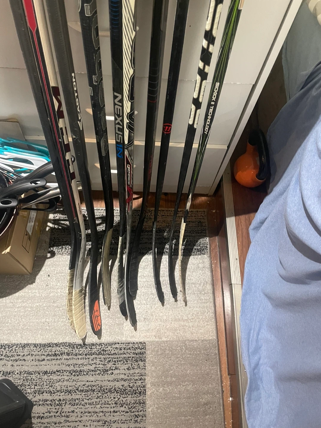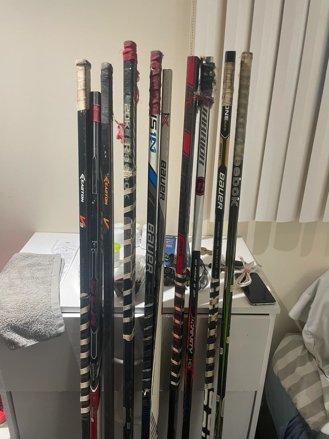 Selling a collection of hockey sticks from various brands including Easton, Bauer, CCM, and Warrior. These sticks are suitable for recreational play or as backups. Used condition with some wear and tear.