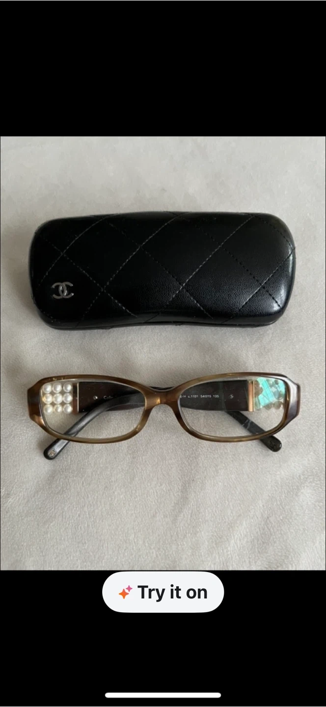 These Chanel eyeglasses feature a stylish design with pearl embellishments on the sides. They come with the original hard case and a soft cleaning pouch. Perfect for adding a touch of luxury to your everyday look!
