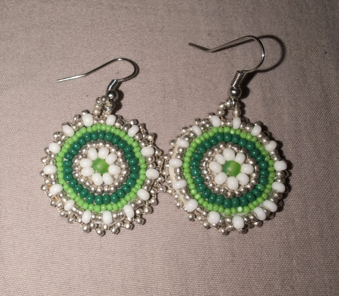 These are a pair of handmade beaded earrings. They feature a circular design with green, white, and silver beads. The earrings have a hook closure and are in great condition!