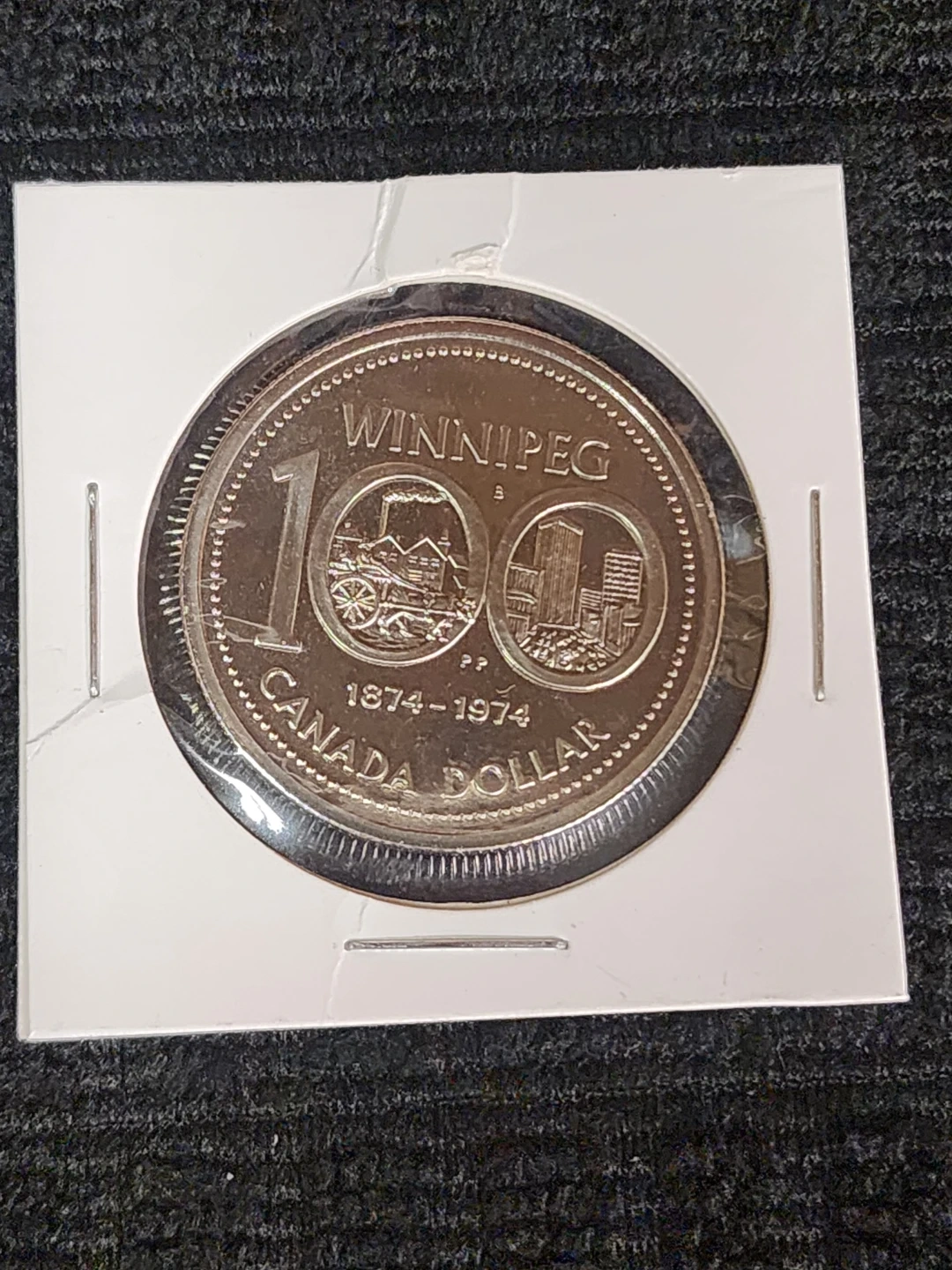 Selling a 1974 Winnipeg Canada Dollar coin. It features a commemorative design celebrating Winnipeg's history. A great addition to any coin collection!