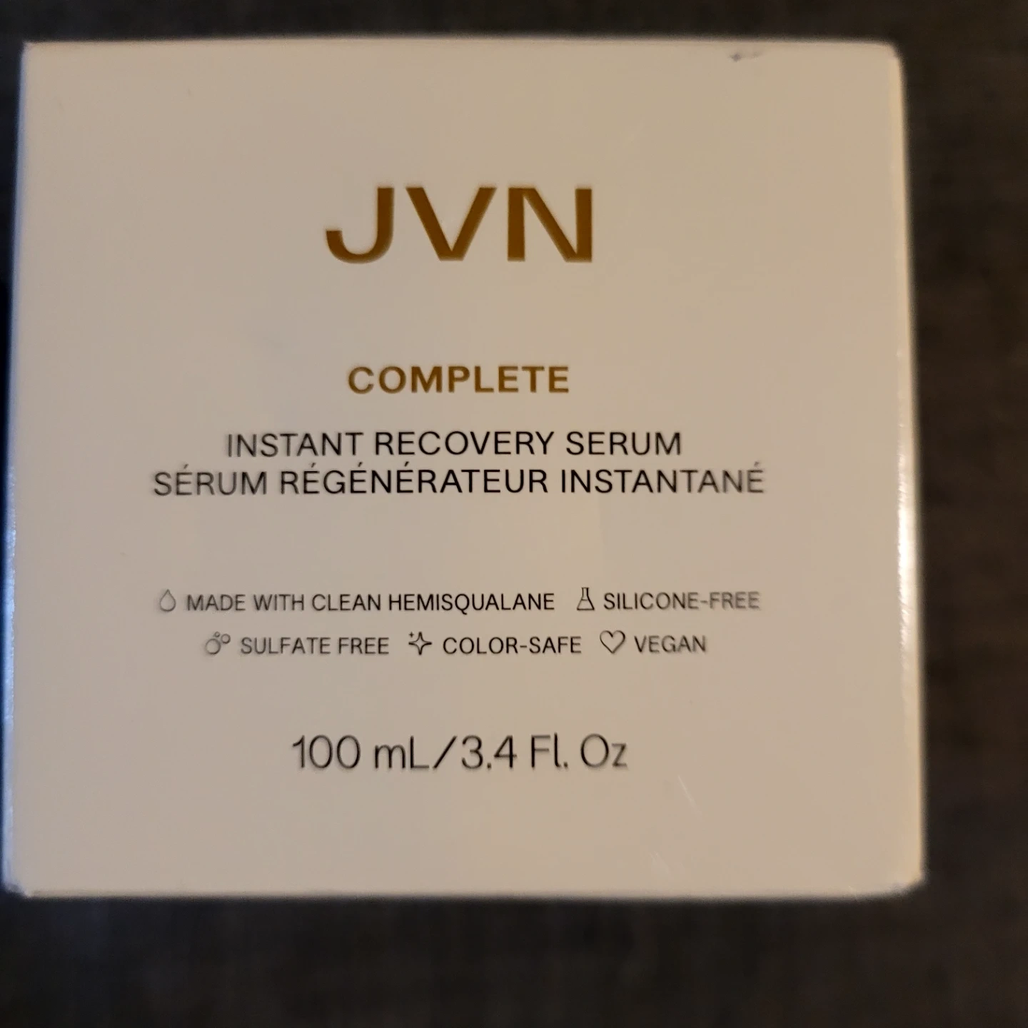 JVN Complete Instant Recovery Serum. Made with clean hemisqualane, it's silicone-free, sulfate-free, and color-safe. This vegan serum comes in a 100ml/3.4 Fl. Oz. size. It's designed for hair recovery.