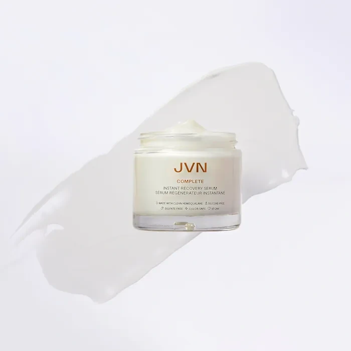 JVN Complete Instant Recovery Serum. Made with clean hemisqualane, it's silicone-free, sulfate-free, and color-safe. This vegan serum comes in a 100ml/3.4 Fl. Oz. size. It's designed for hair recovery.