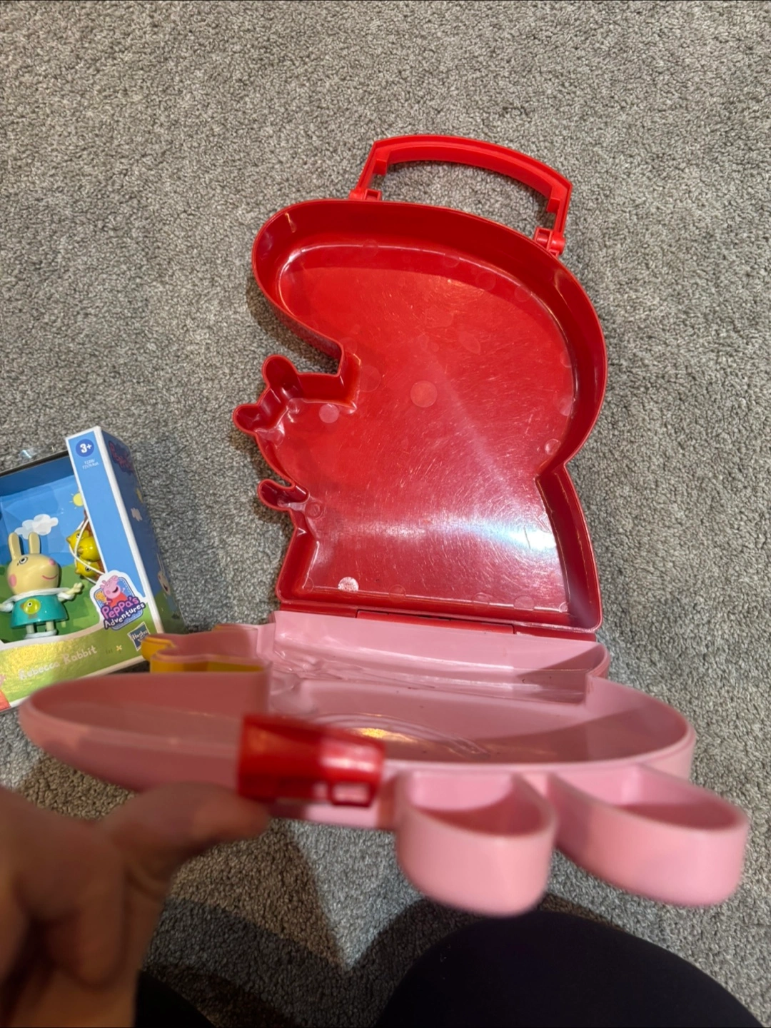 This Peppa Pig toy set includes the Rebecca Rabbit figure in her original packaging. It also comes with a Peppa Pig shaped red and pink carry case, and a yellow teddy bear accessory. Recommended for ages 3 and up.