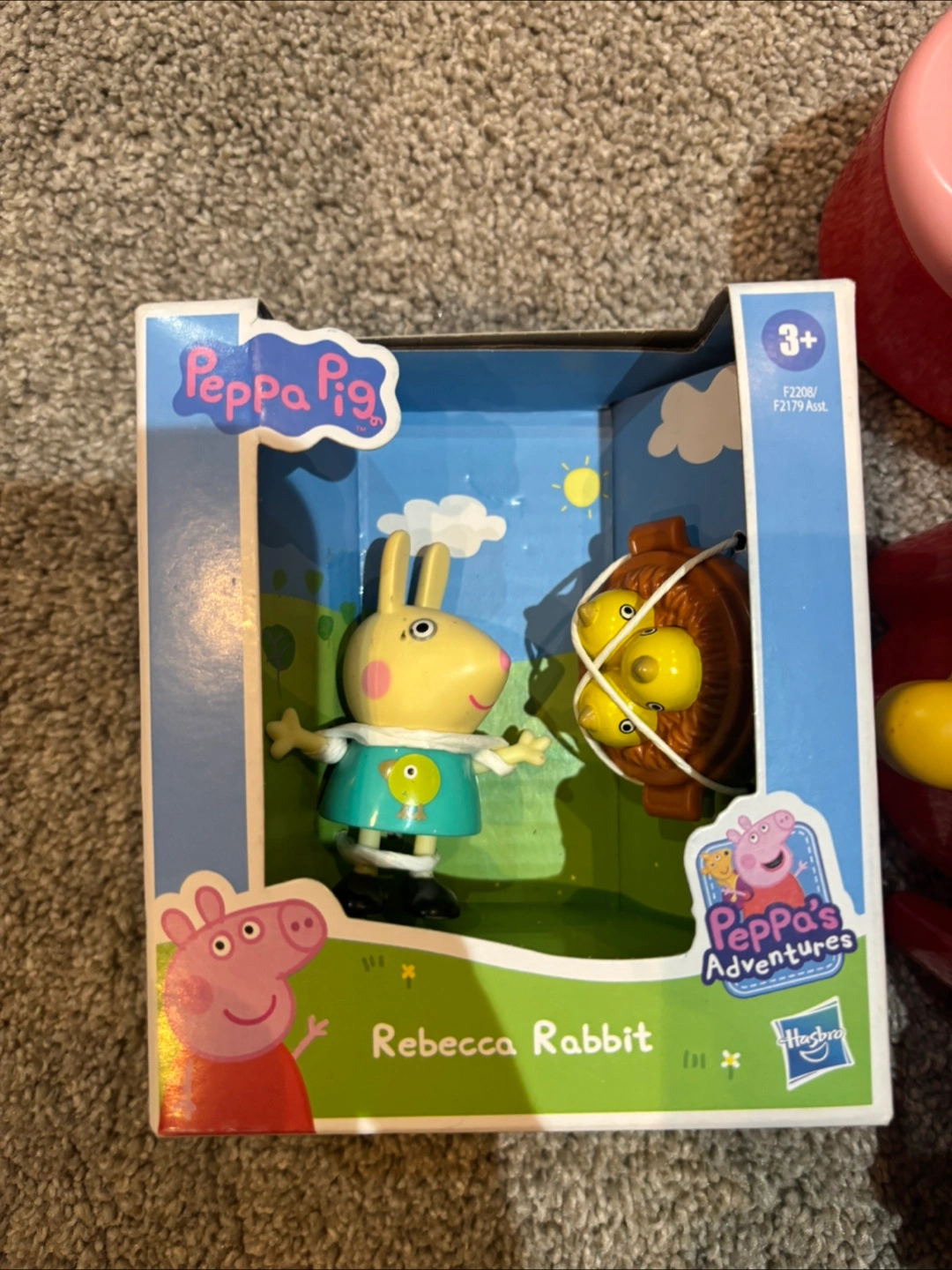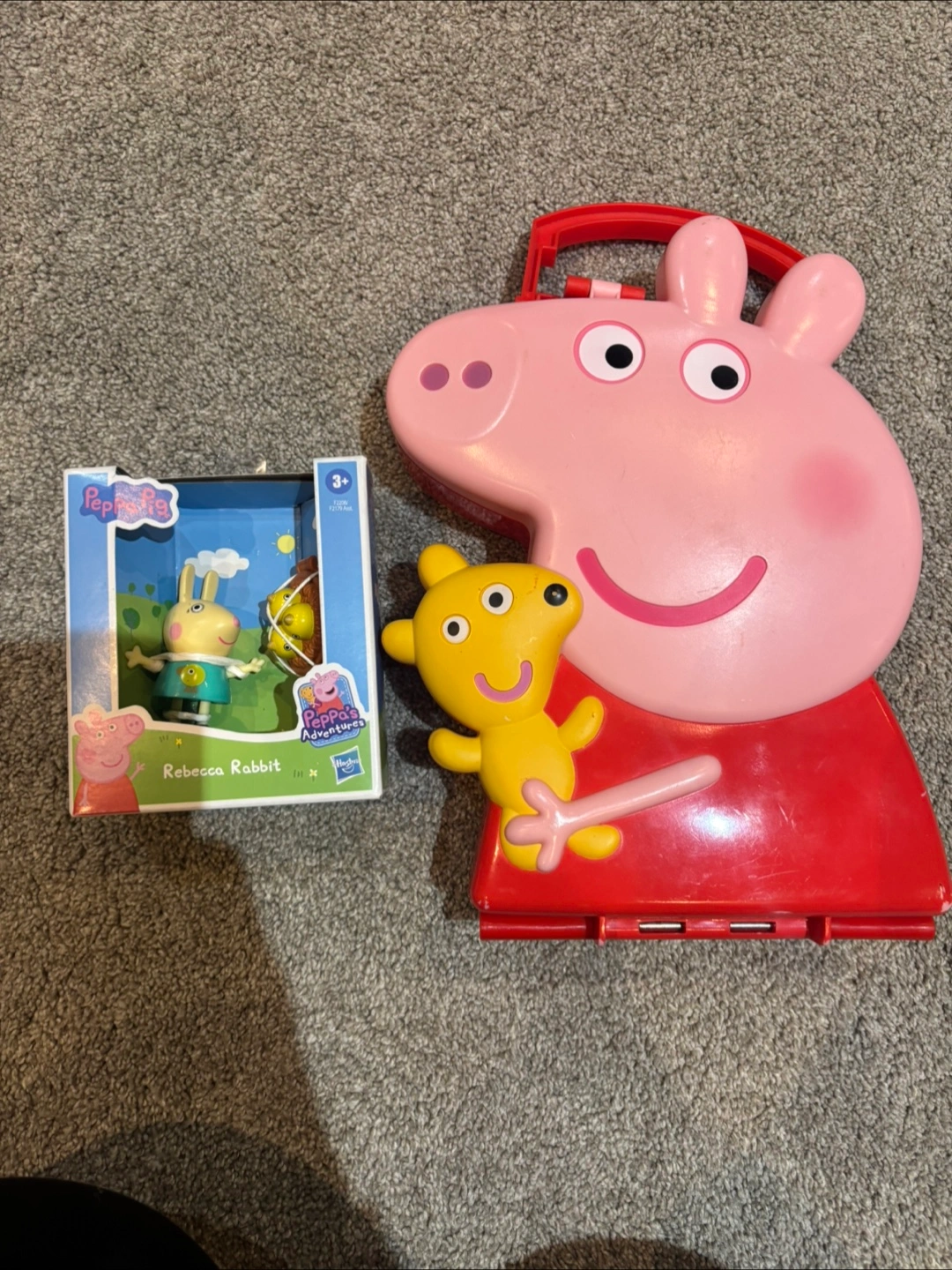 This Peppa Pig toy set includes the Rebecca Rabbit figure in her original packaging. It also comes with a Peppa Pig shaped red and pink carry case, and a yellow teddy bear accessory. Recommended for ages 3 and up.