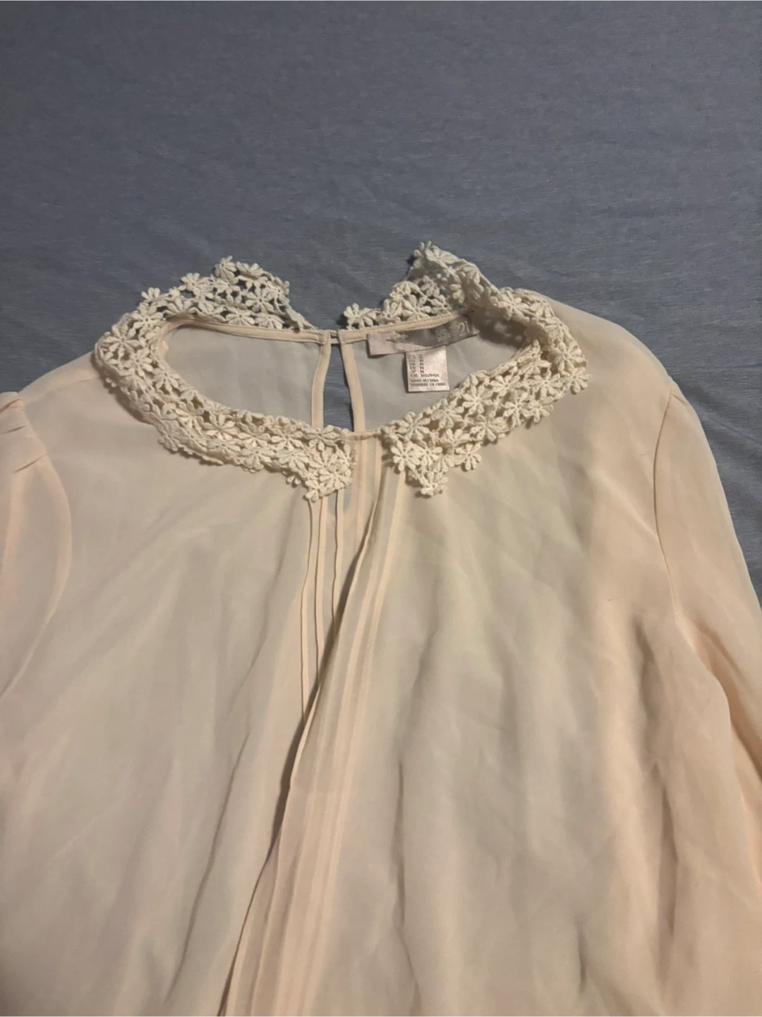 Here's a cute Forever 21 blouse in a lovely cream colour. It has a sheer look and features delicate lace detailing around the collar and cuffs. Perfect for adding a touch of elegance to your outfit!
