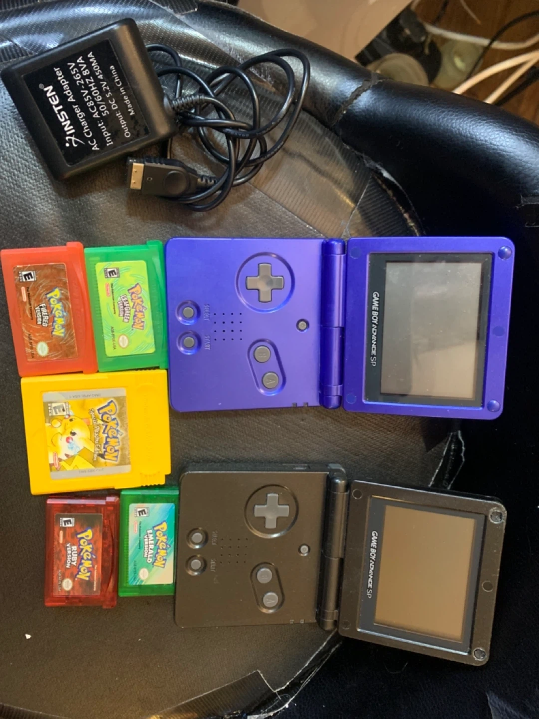 Includes two Game Boy Advance SP consoles, one in purple and one in black. Comes with several Pokémon game cartridges, including FireRed, LeafGreen, Emerald, and Ruby versions, plus a Special Pikachu edition. Also includes an AC charger adapter. 900 for everything or can be discussed if wanting only one thing