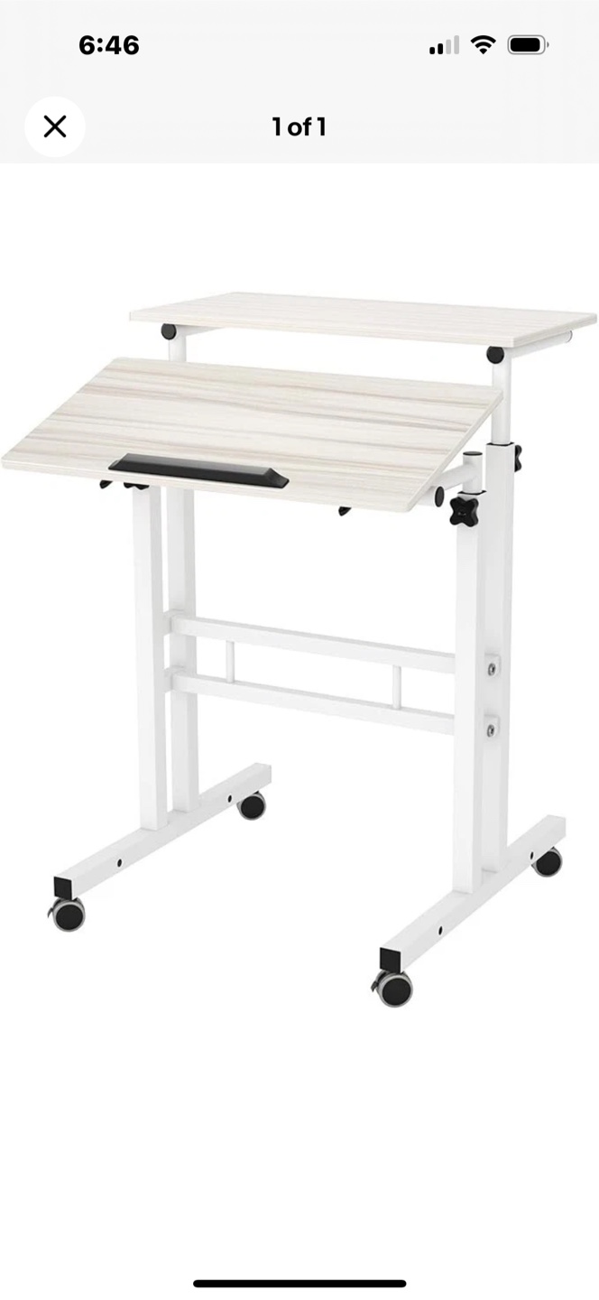 White standing desk. Two-tiered design. Features adjustable height and locking wheels. Light wood grain top.