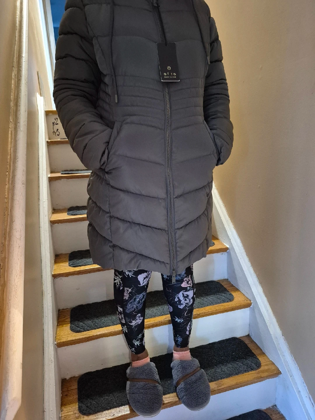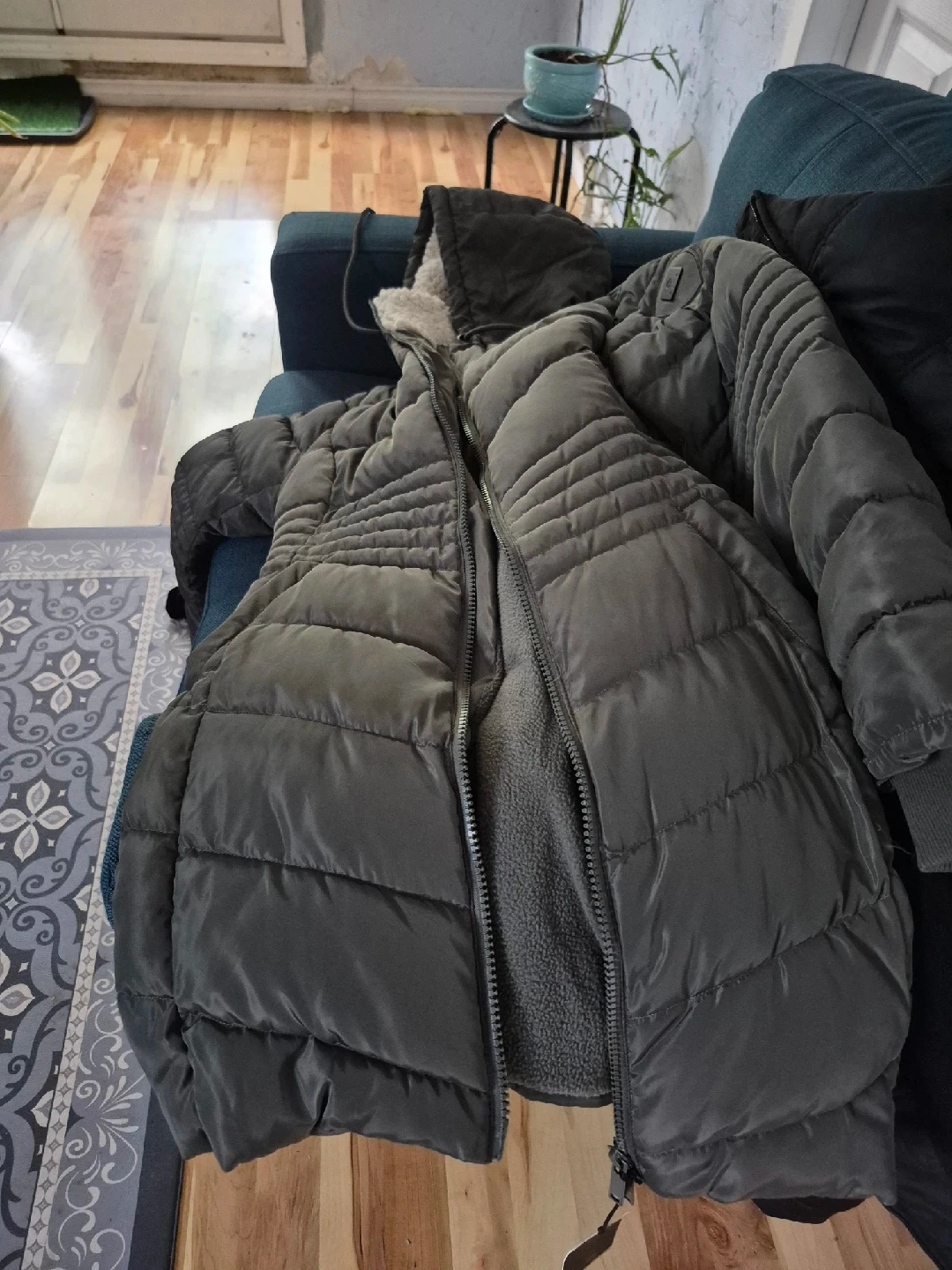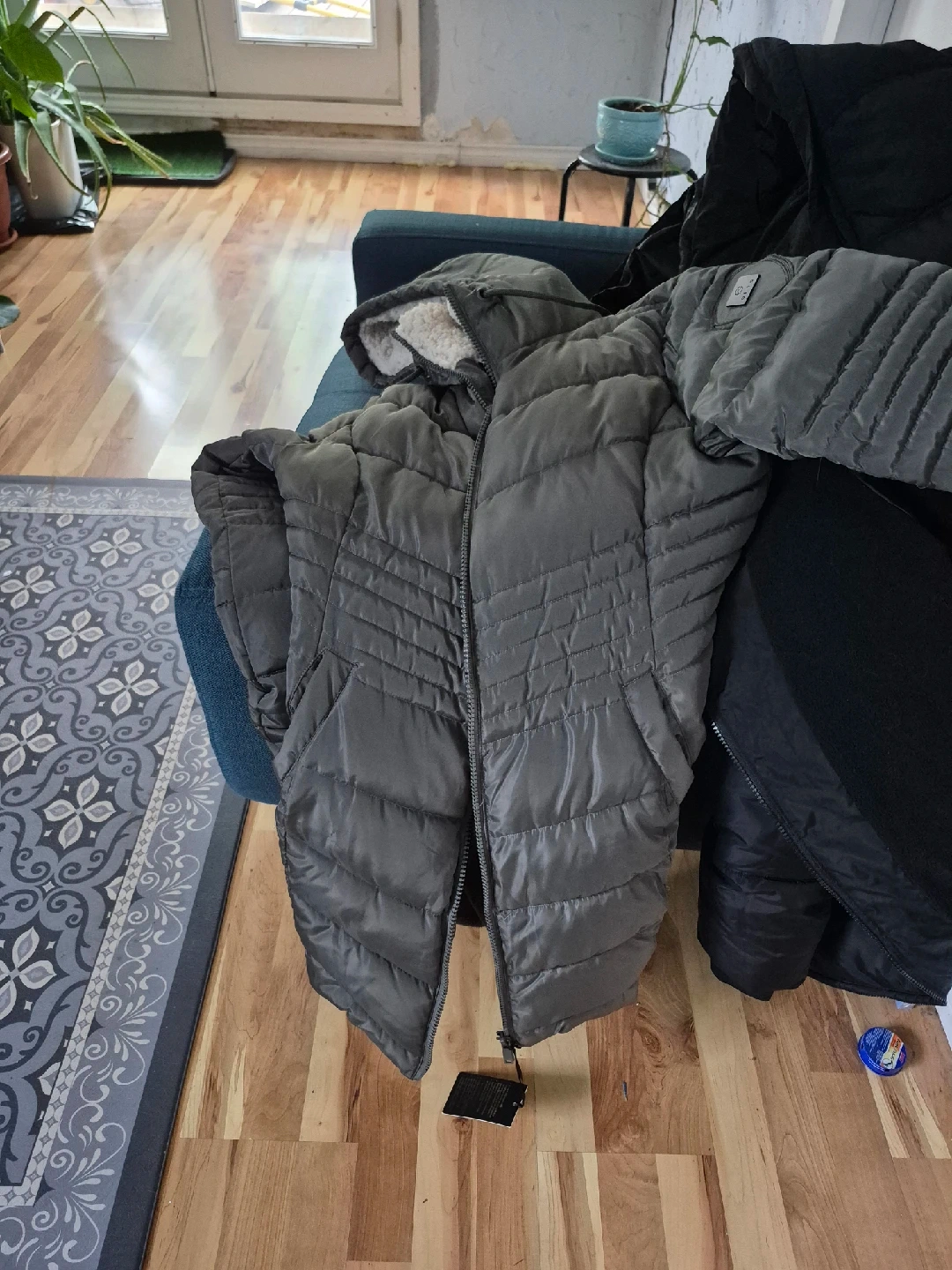A cozy grey puffer jacket, perfect for the colder weather! It's in great condition