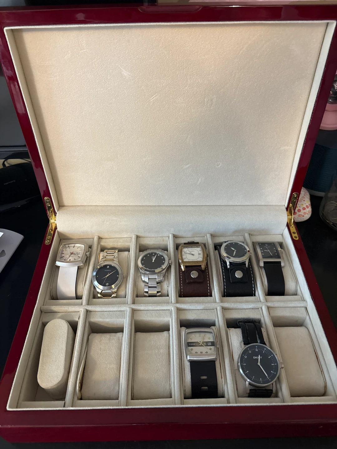 Selling a watch storage box that can hold up to 10 watches. It's a nice way to keep your watches organized and protected!