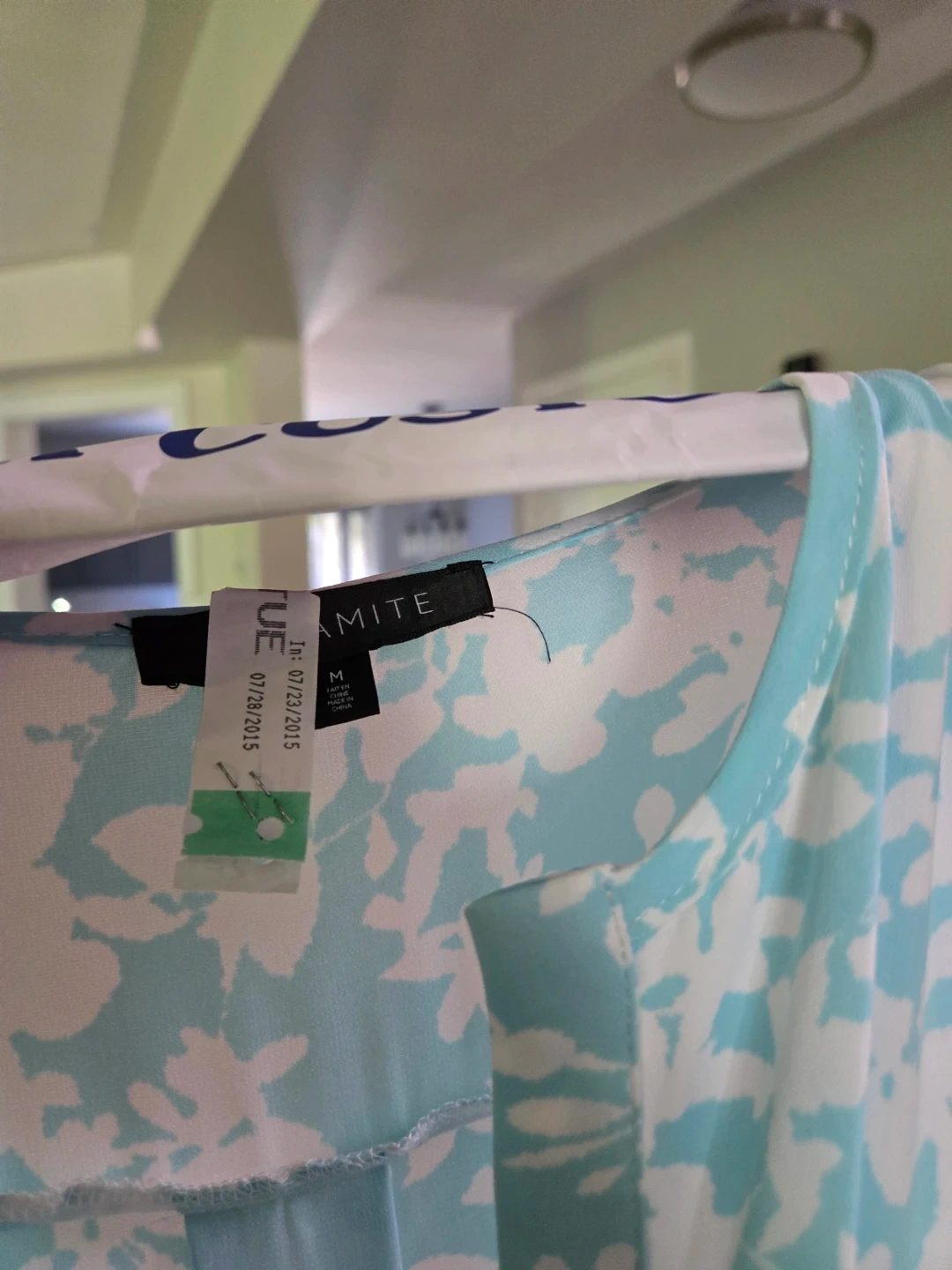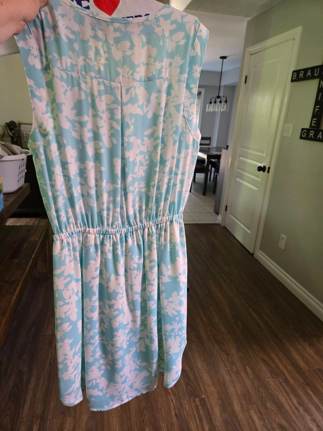 Dynamite sleeveless shirt dress with a blue and white floral print. It features a drawstring waist and a button-up neckline. Size medium.