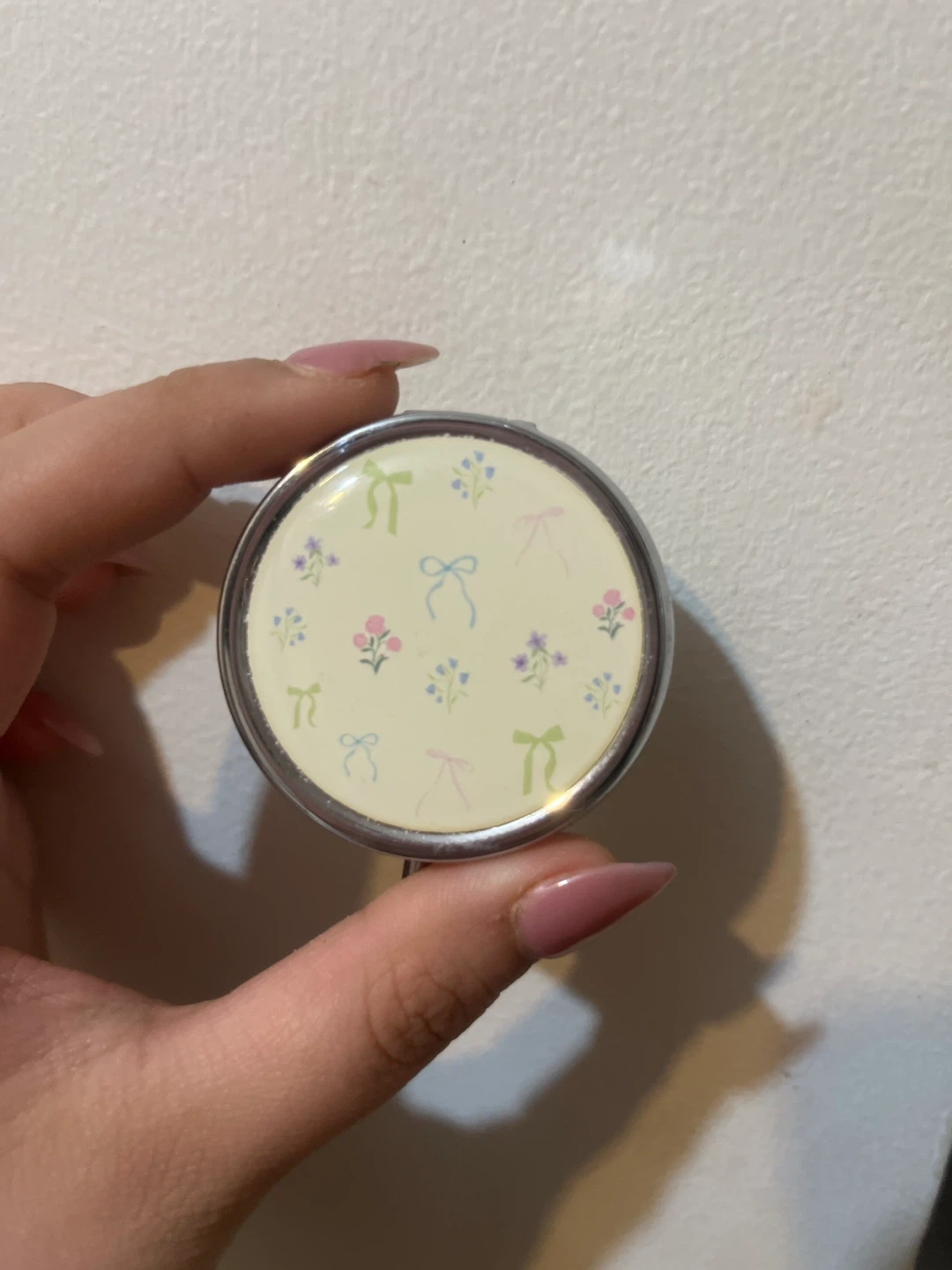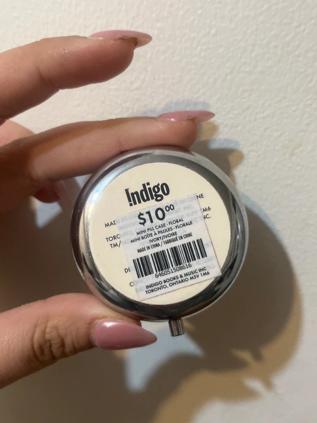 This is an Indigo mini pill case with a floral design in ivory. It's perfect for keeping your medication or small essentials organized on the go. Compact and stylish, it's a handy accessory for anyone needing to carry pills.