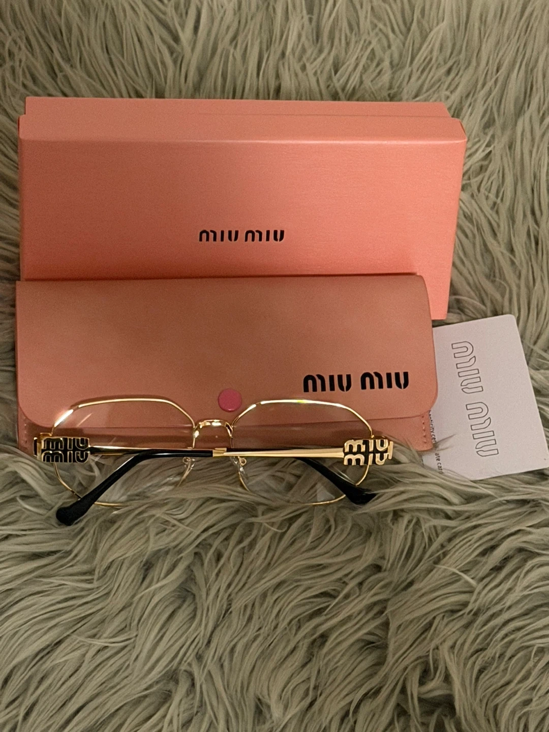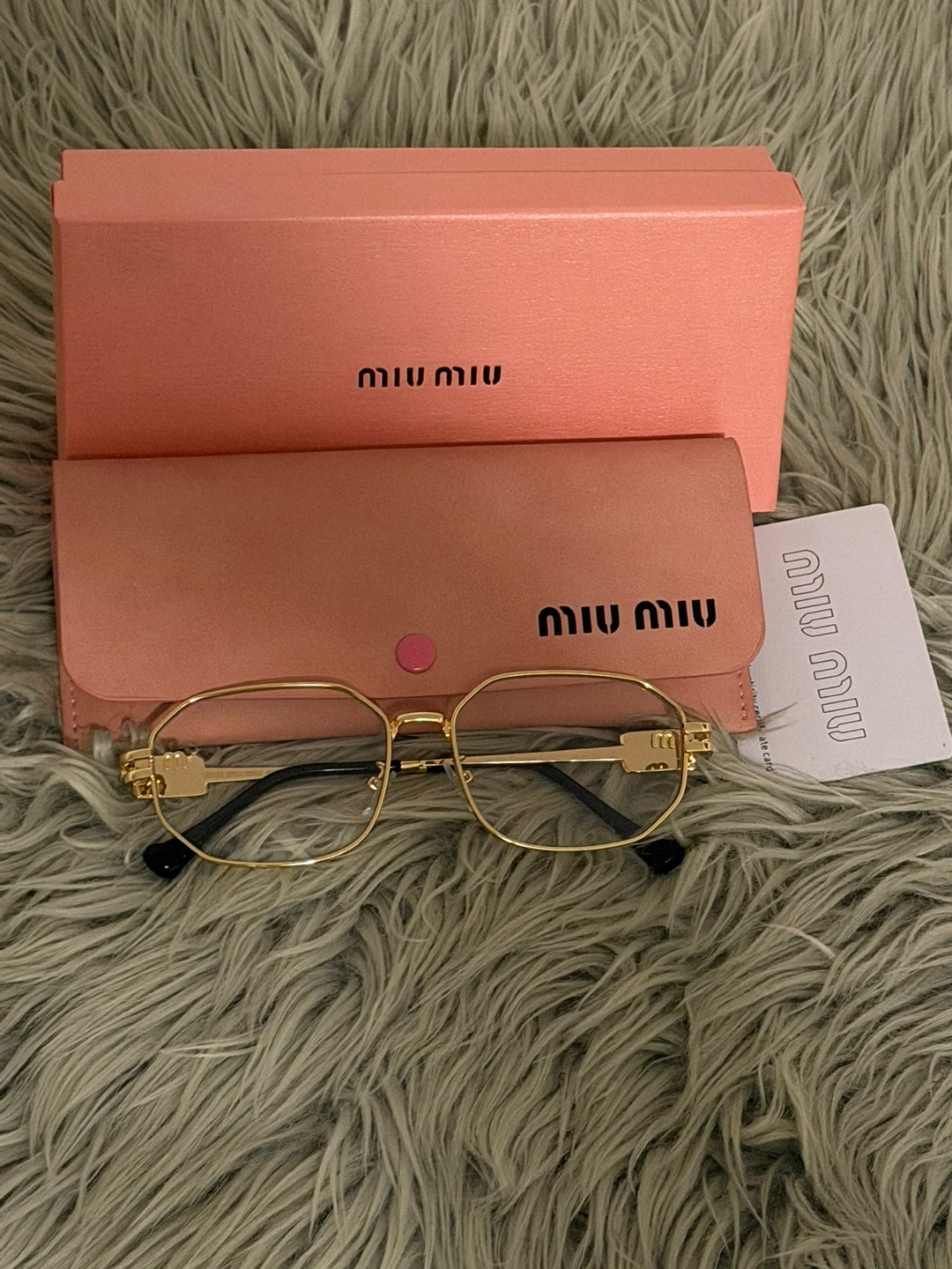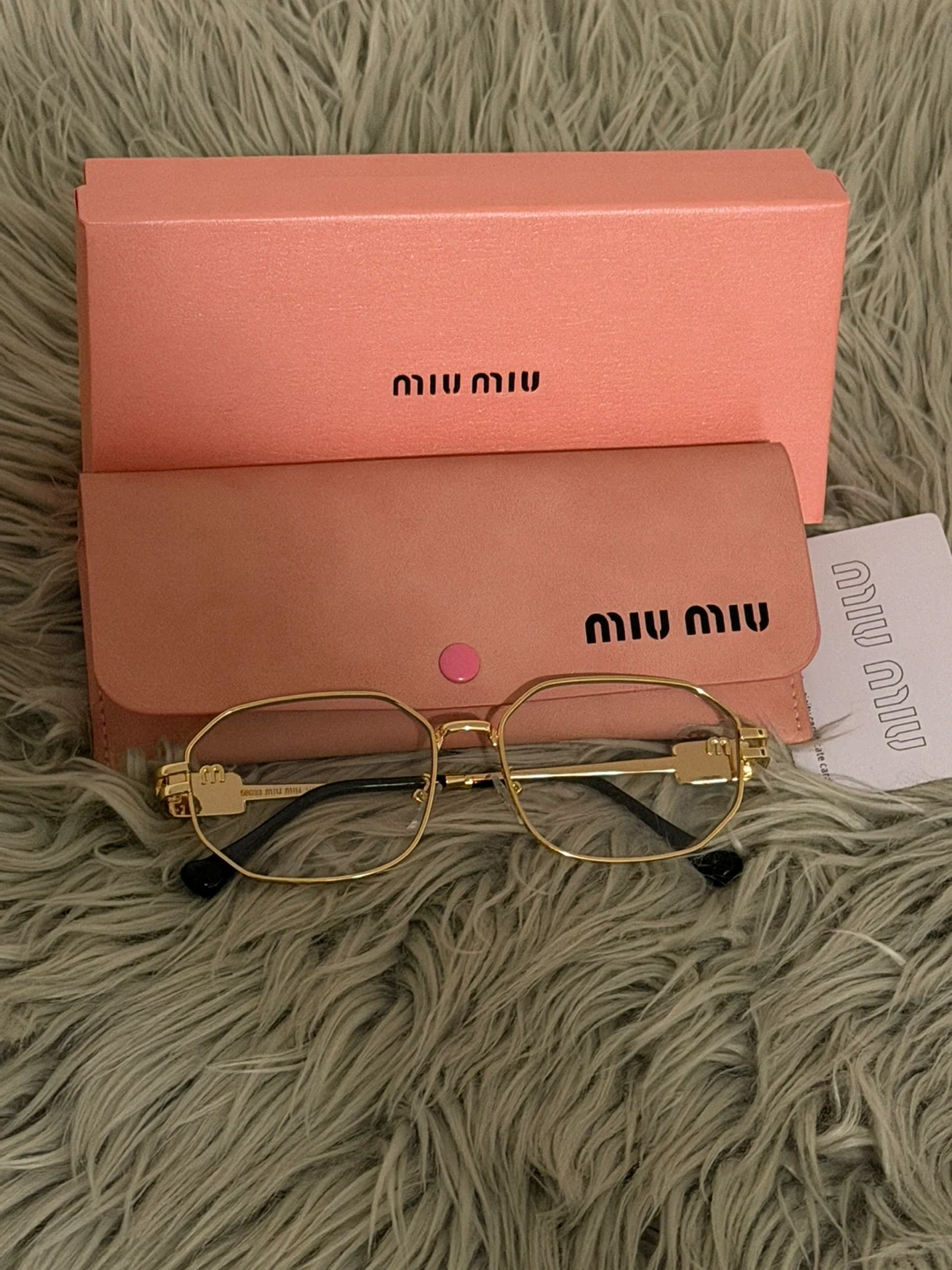Miu Miu eyeglasses with a gold metal oval frame. Comes with its original pink case and box. These stylish frames are perfect for anyone looking for a chic accessory.