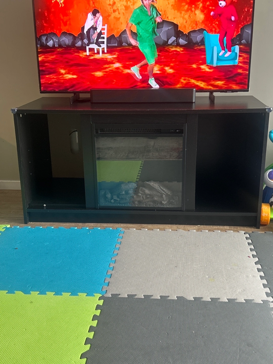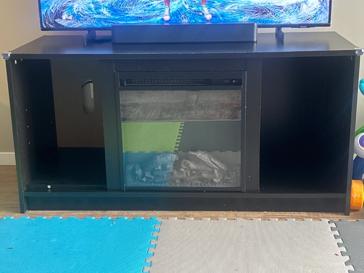 Black TV stand with built-in electric fireplace and heater. Multiple storage compartments. Good for smaller spaces. Designed to hold flat-screen TVs up to 55 inches and weighing up to 60 lbs., it offers ample storage with open shelves, and efficient wire management. What truly distinguishes it is the integrated electric fireplace. Featuring realistic LED flames, a log set, it adds a cozy ambiance, while the tempered glass front adds a contemporary touch. Not only does it elevate your room's aesthetics, but it also functions as a heater, efficiently warming up to 400 square feet. Additionally, you can enjoy the flames with or without heat, making it suitable for year-round use.