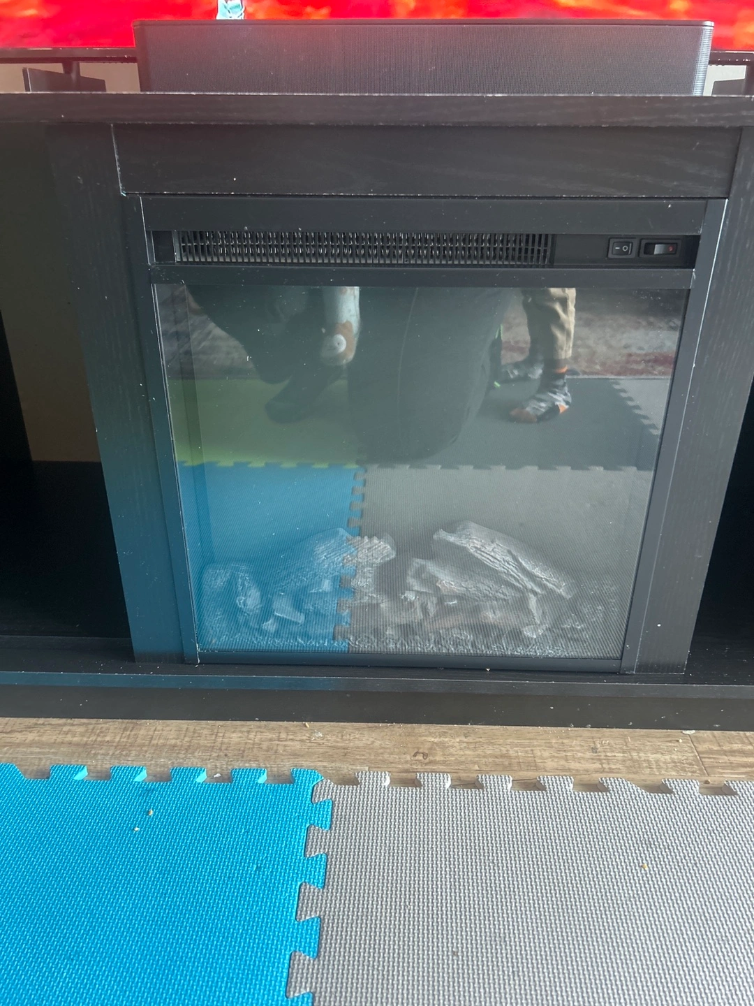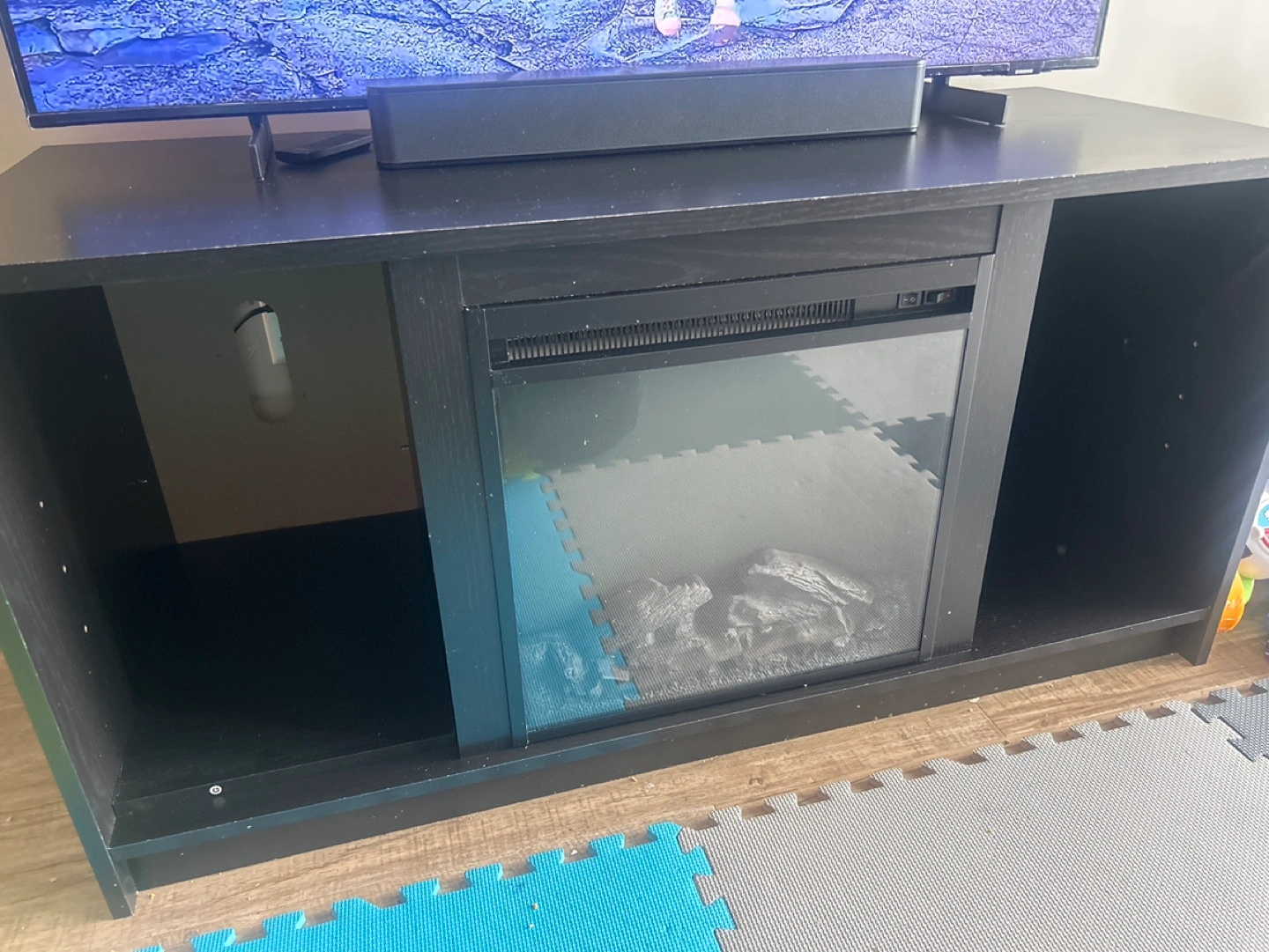 Black TV stand with built-in electric fireplace and heater. Multiple storage compartments. Good for smaller spaces. Designed to hold flat-screen TVs up to 55 inches and weighing up to 60 lbs., it offers ample storage with open shelves, and efficient wire management. What truly distinguishes it is the integrated electric fireplace. Featuring realistic LED flames, a log set, it adds a cozy ambiance, while the tempered glass front adds a contemporary touch. Not only does it elevate your room's aesthetics, but it also functions as a heater, efficiently warming up to 400 square feet. Additionally, you can enjoy the flames with or without heat, making it suitable for year-round use.