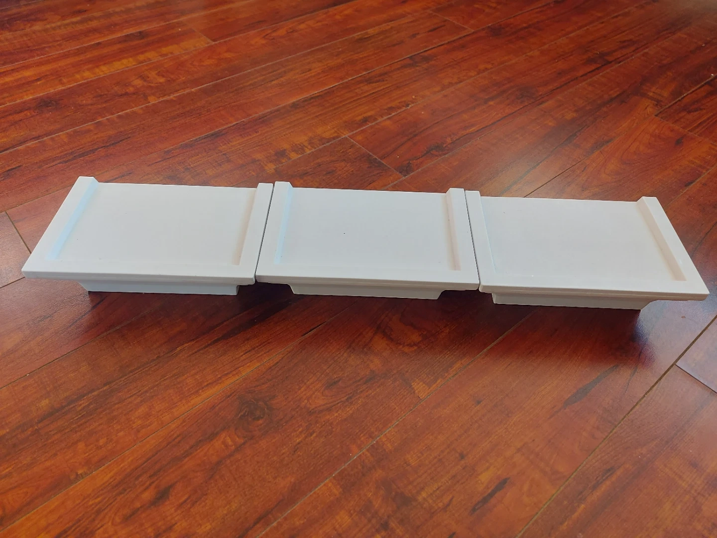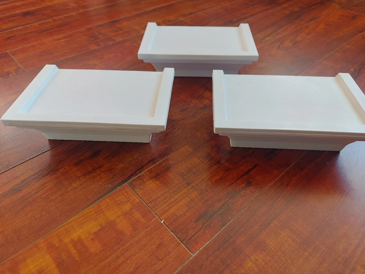 Set of three white rectangular shelves. They're made of a sturdy material and measure approximately 6 inches in length and 3.5 inches in width. Includes mounting hardware for installation. These shelves are suitable for displaying small items or organizing spaces.