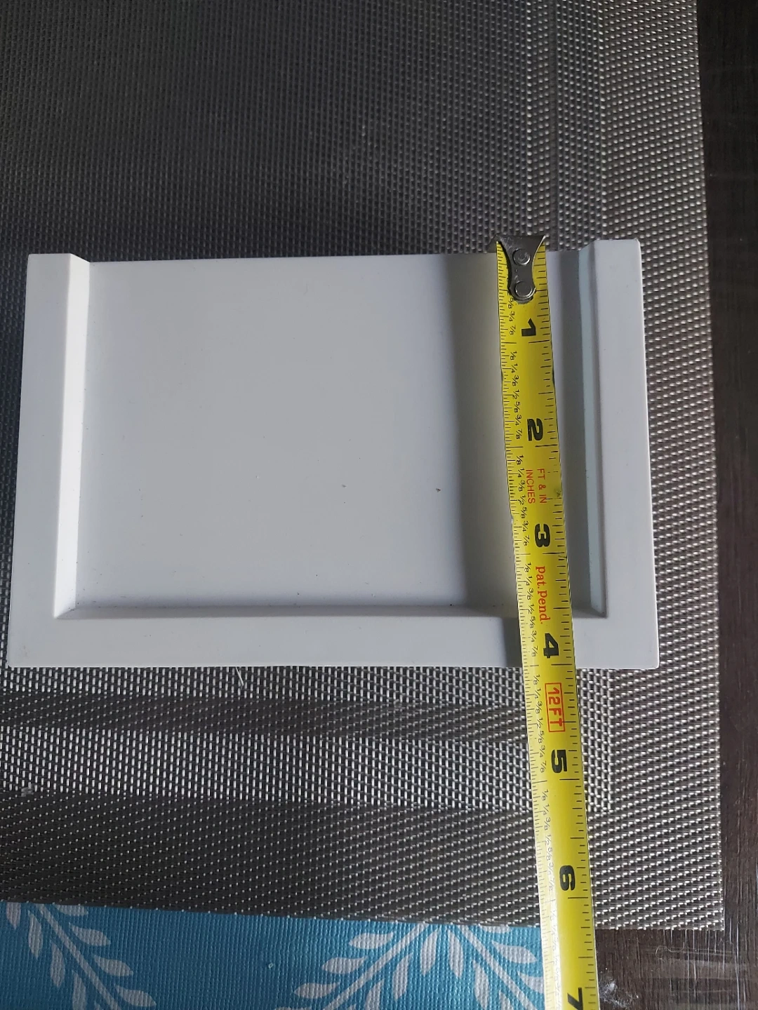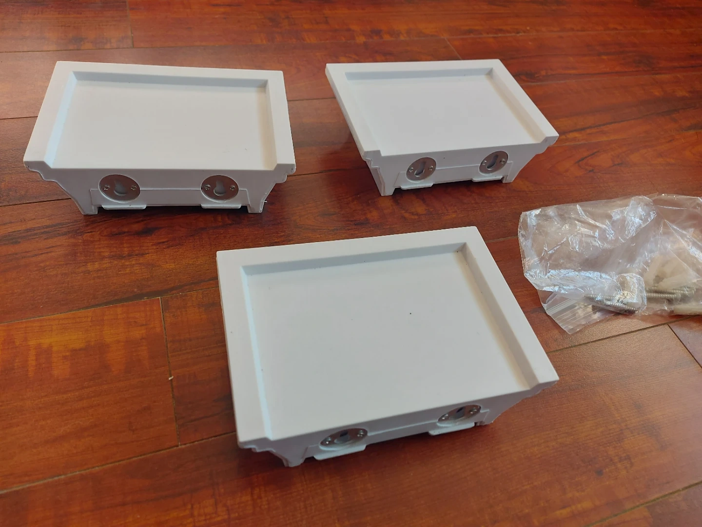 Set of three white rectangular shelves. They're made of a sturdy material and measure approximately 6 inches in length and 3.5 inches in width. Includes mounting hardware for installation. These shelves are suitable for displaying small items or organizing spaces.