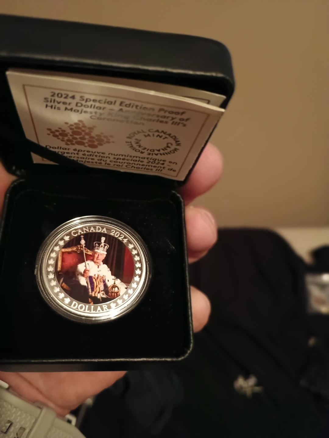 This is a 2024 Special Edition Proof Silver Dollar commemorating the Coronation of His Majesty King Charles III. It includes the original box and certificate. This coin features a detailed image of the King.