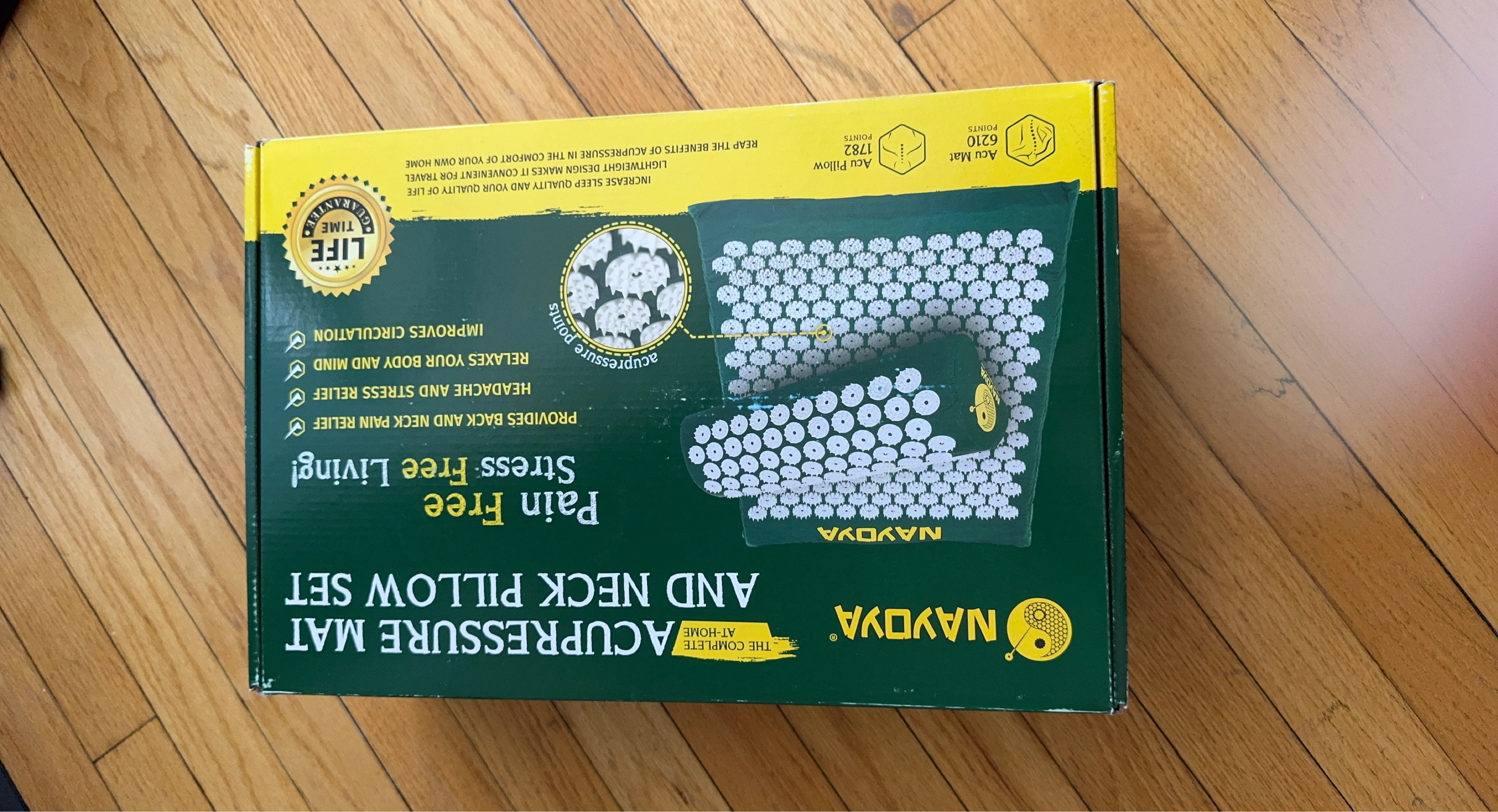 This is the complete at-home Nayoya acupressure mat and neck pillow set. It provides back and neck pain relief, and helps relax your body and mind. The mat and pillow are lightweight and convenient for travel.
