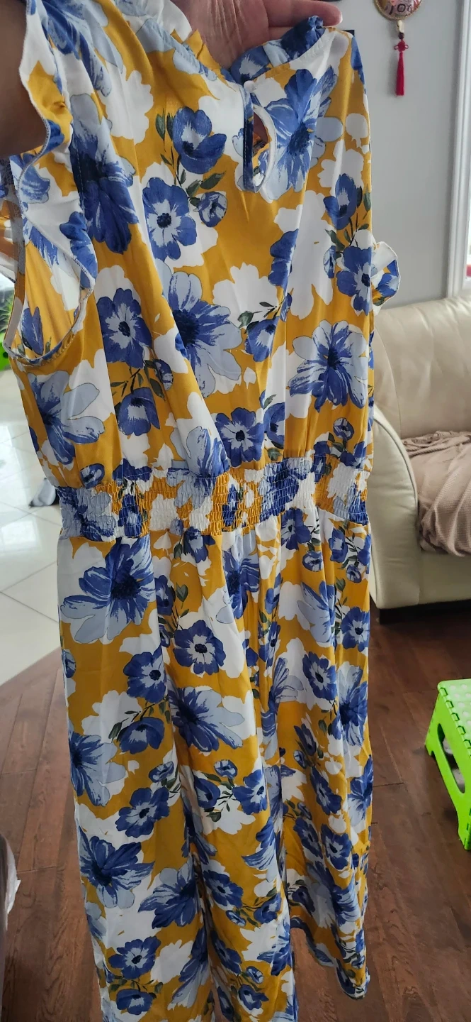 This is a women's sundress with a yellow base and a blue floral print. It has a cinched waist with elastic. Ruffled cap sleeves add a nice touch. It's perfect for warm weather outings!