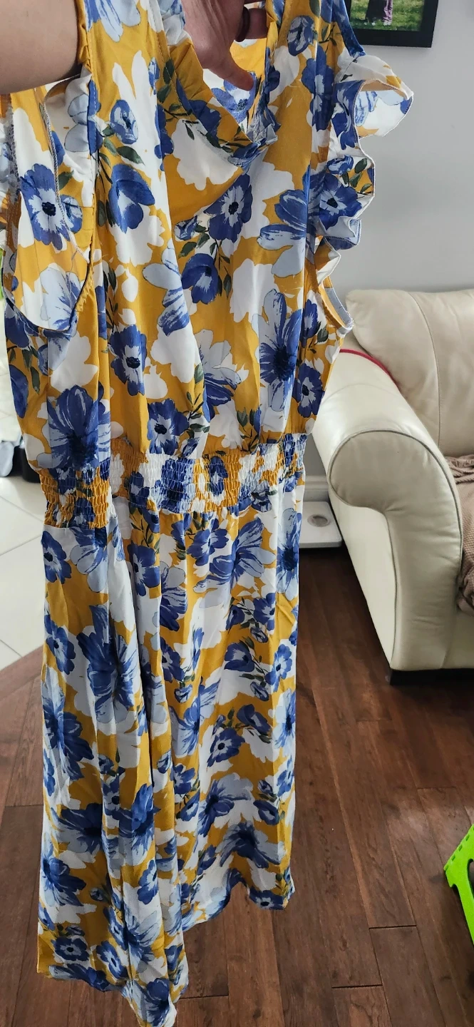 This is a women's sundress with a yellow base and a blue floral print. It has a cinched waist with elastic. Ruffled cap sleeves add a nice touch. It's perfect for warm weather outings!