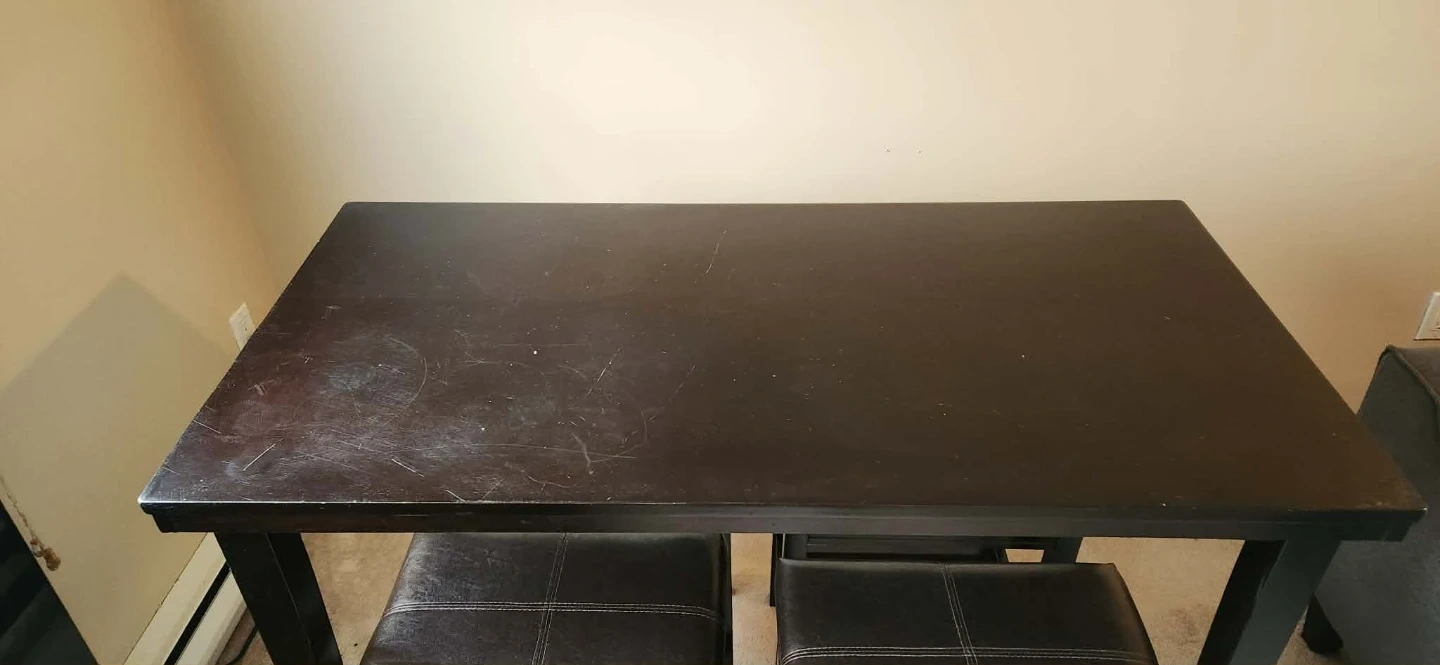 This is a dark wood dining set that includes a table and three matching stools. The stools have a faux leather upholstery. It's a compact set, perfect for smaller spaces. Some imperfections on top but still in great condition. Stools in perfect condition and very comfortable.