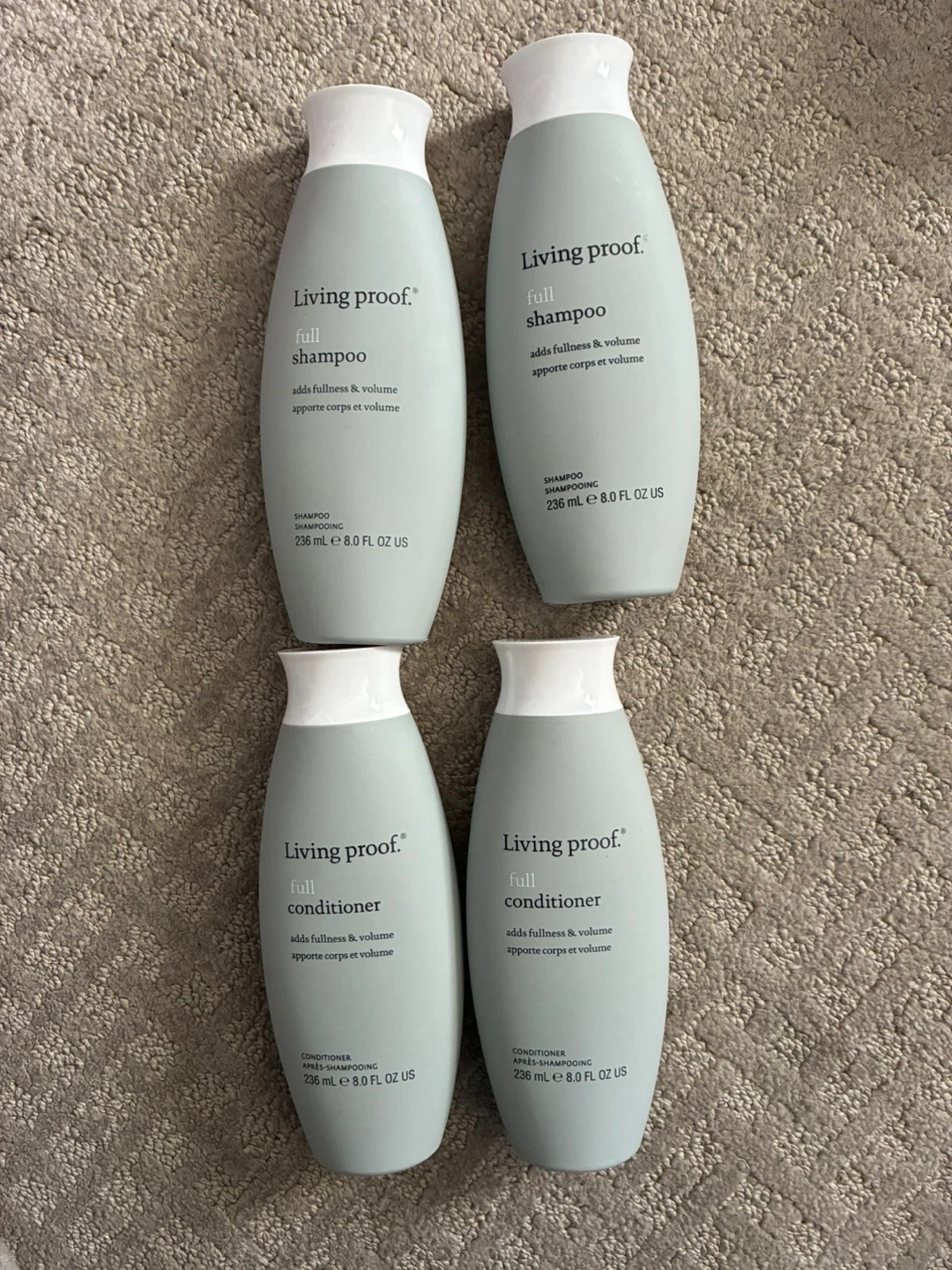 Living Proof Full Shampoo bottles and Full Conditioner bottles. Each bottle contains 236 ml or 8.0 fl oz. These products add fullness and volume.