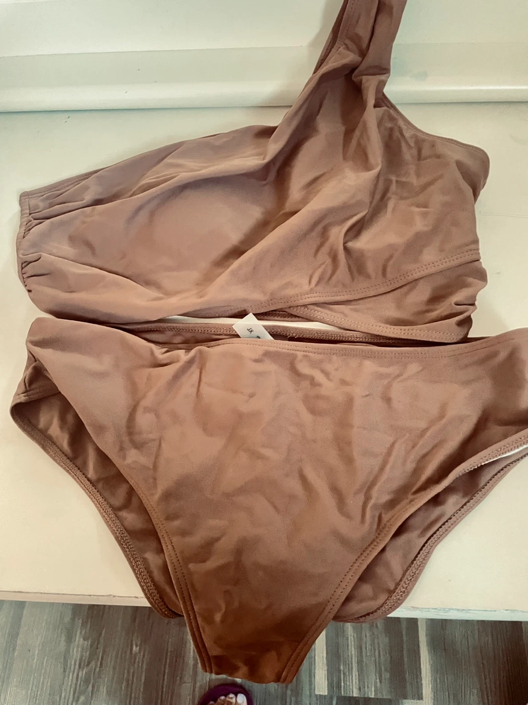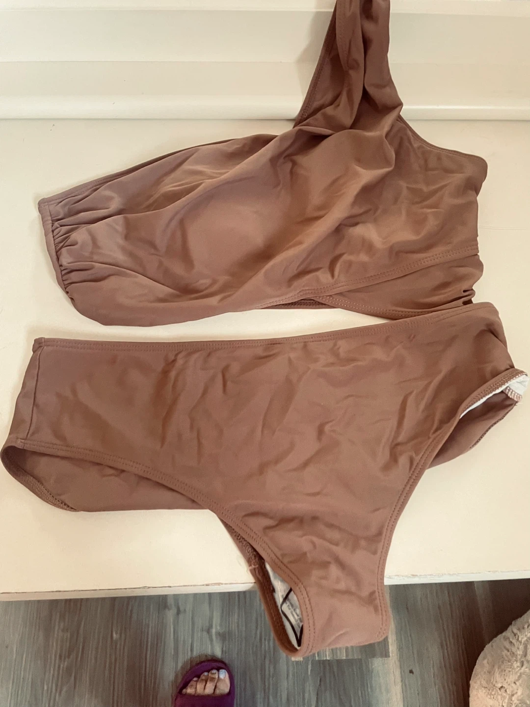 This is a stylish brown one-shoulder bikini set. It's made from a comfortable, stretchy material perfect for beach days. The set includes a one-shoulder top and matching bikini bottoms.