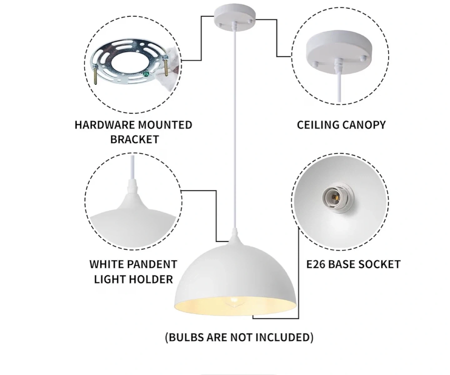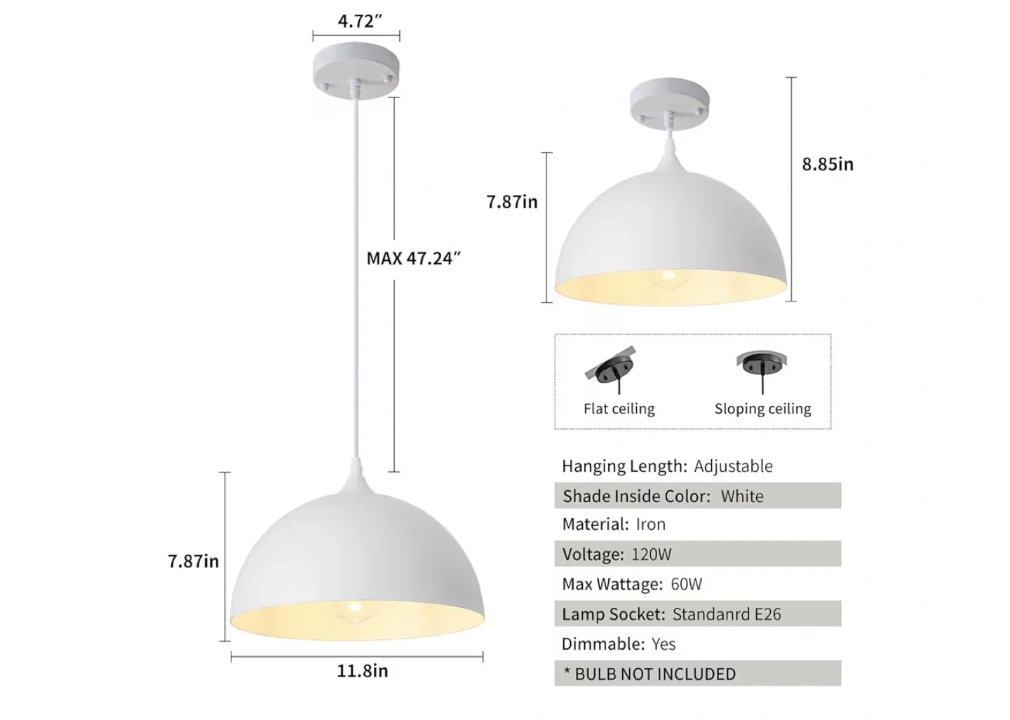 White farmhouse style pendant light with a dome shade. It features an adjustable hanging length up to 47.24 inches. The material is iron and it has a standard E26 lamp socket. Bulbs are not included. Suitable for flat or sloping ceilings!