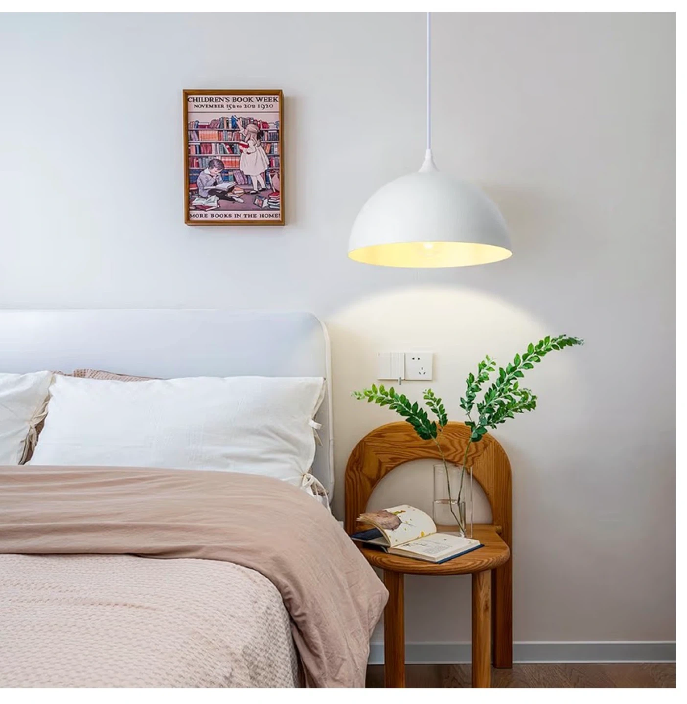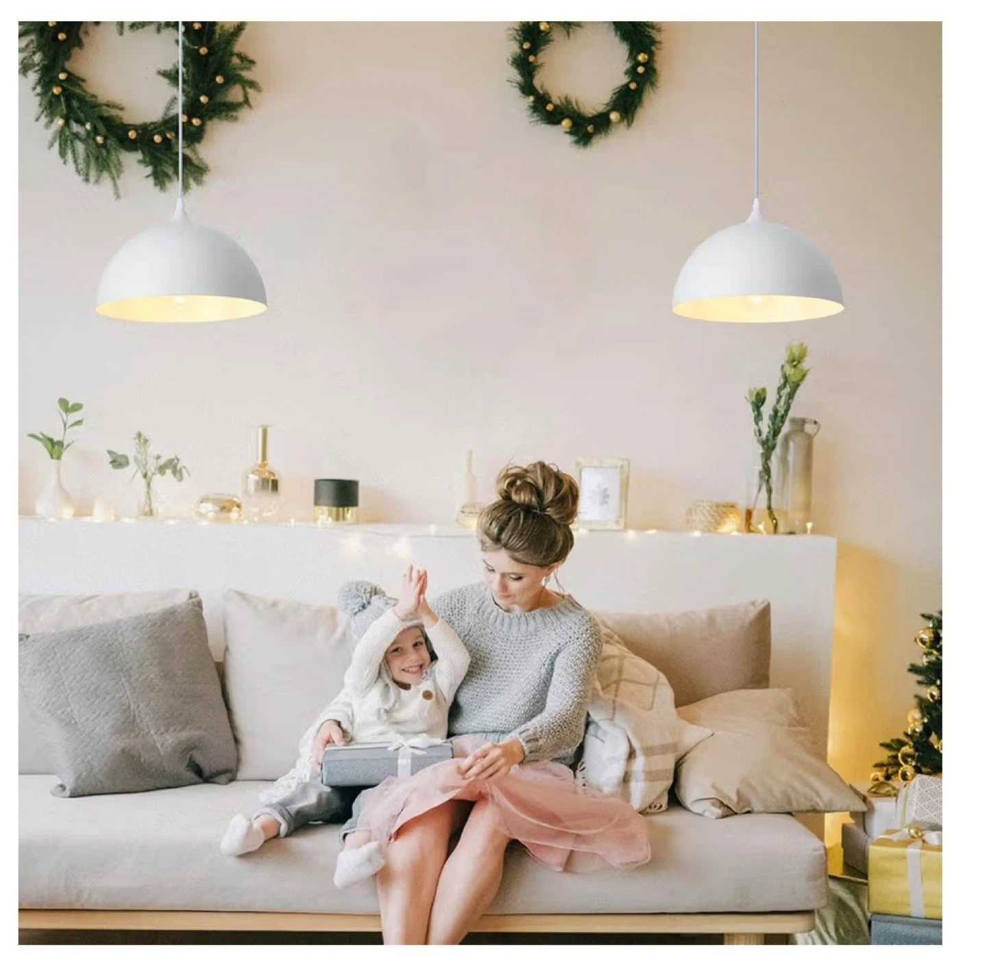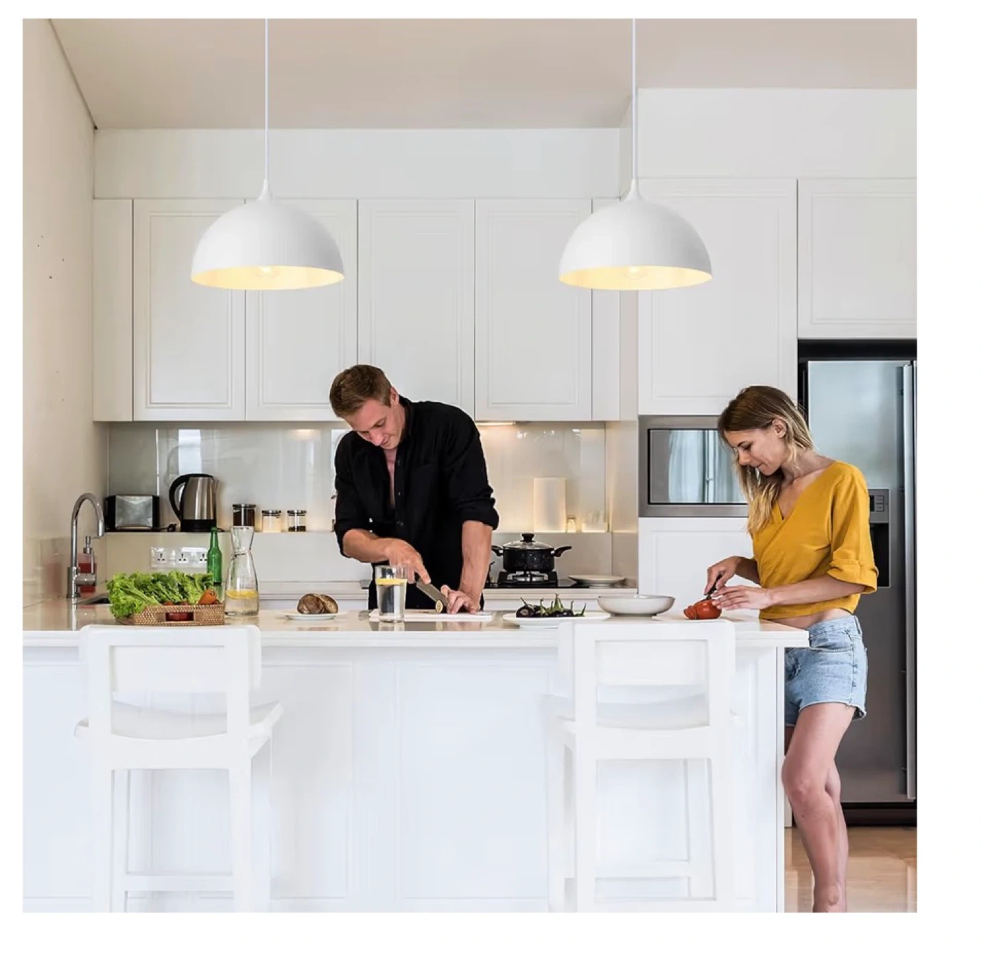 White farmhouse style pendant light with a dome shade. It features an adjustable hanging length up to 47.24 inches. The material is iron and it has a standard E26 lamp socket. Bulbs are not included. Suitable for flat or sloping ceilings!