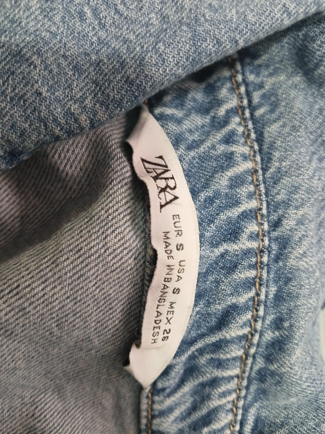 A stylish cropped denim jacket from Zara. It's made of cotton denim and features a collared neckline with button closures. The jacket has two chest pockets with button flaps and button cuffs on the sleeves. It's a size S and was made in Bangladesh. This jacket's classic look makes it a versatile addition to any wardrobe!