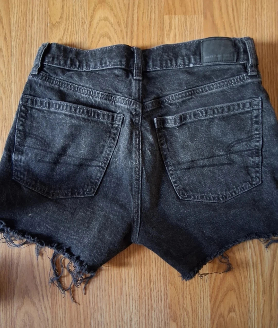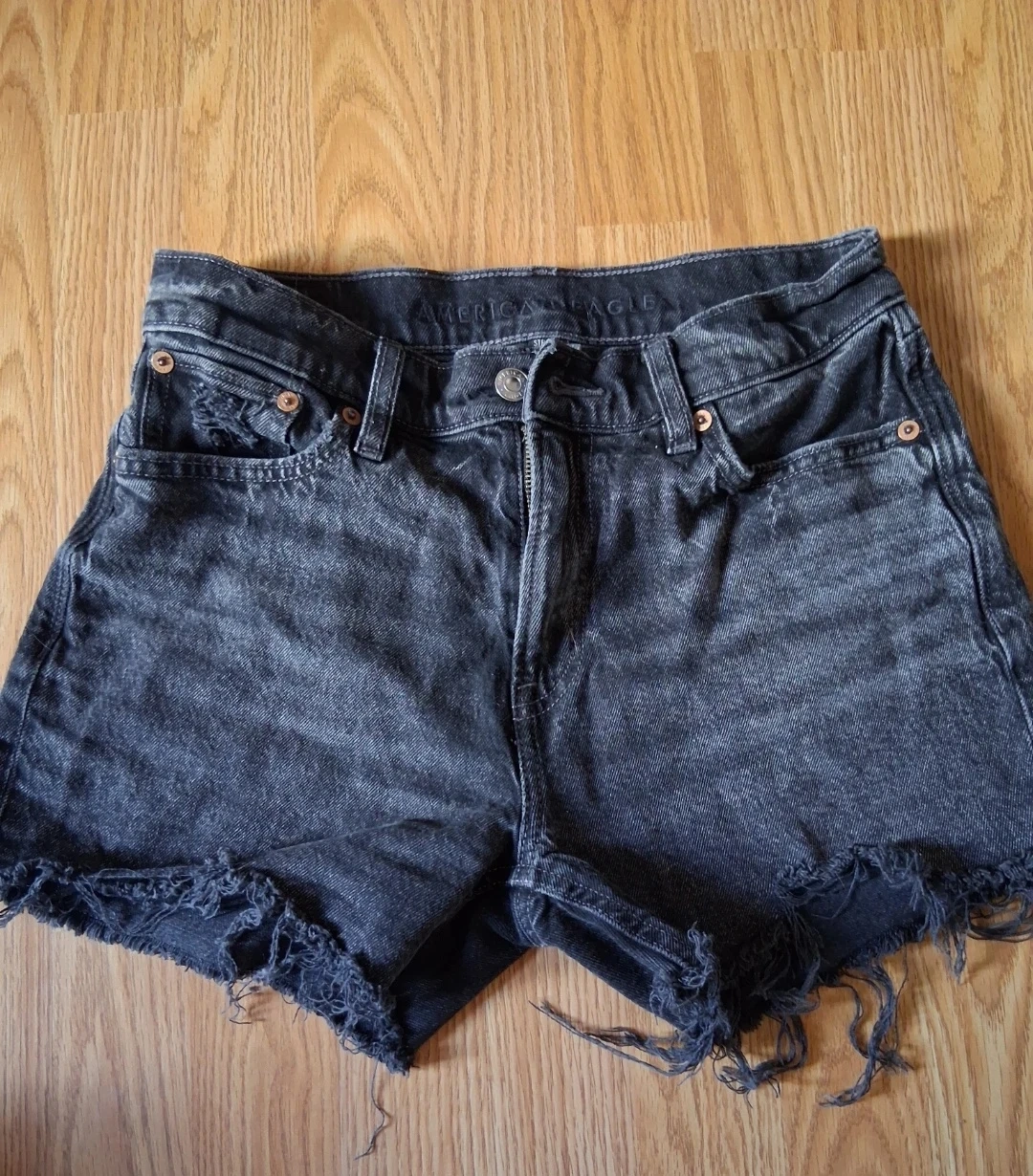 These are American Eagle black denim shorts with a distressed, frayed hem. Made with a cotton blend for comfort. Perfect for casual wear in warmer weather!