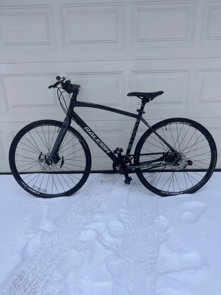 Selling my Raleigh bike. It has a belt drive (no greasy chain) and an internal gear hub. Disc brakes front and rear provide solid stopping power in all weather. 700c wheels give it a lightweight feel. Size: Medium. I’ve had it for 6 months.