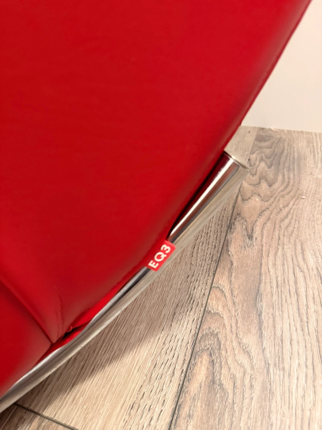 Authentic EQ3 James Rocking Chair in bold red upholstery with chrome rocking base.