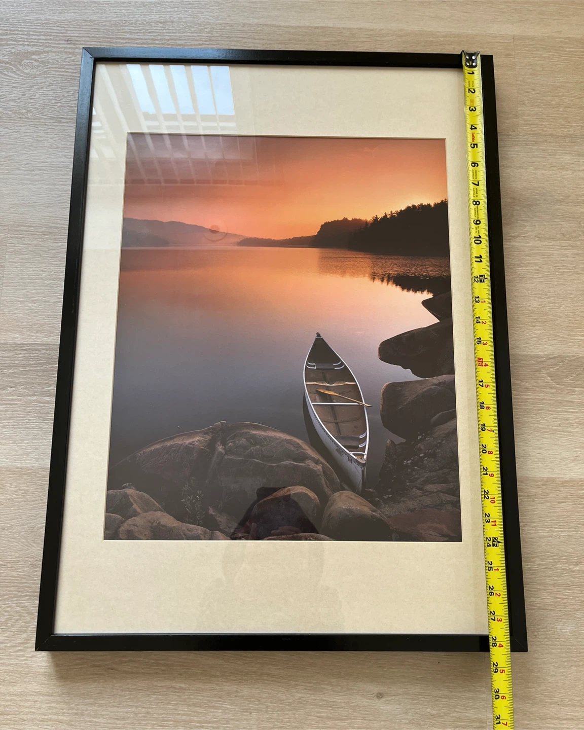 This framed print complete with a mat and black frame. Dimensions are approximately 22 inches tall by 16 inches wide and 1-1/4 depth inches. It's a lovely piece to add to any room!