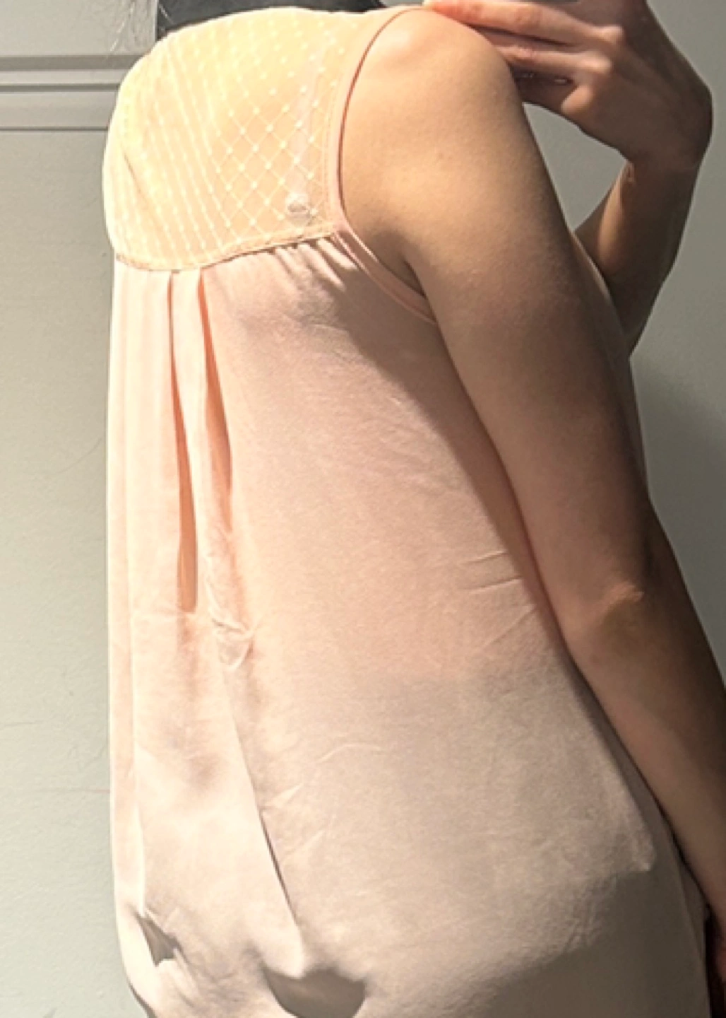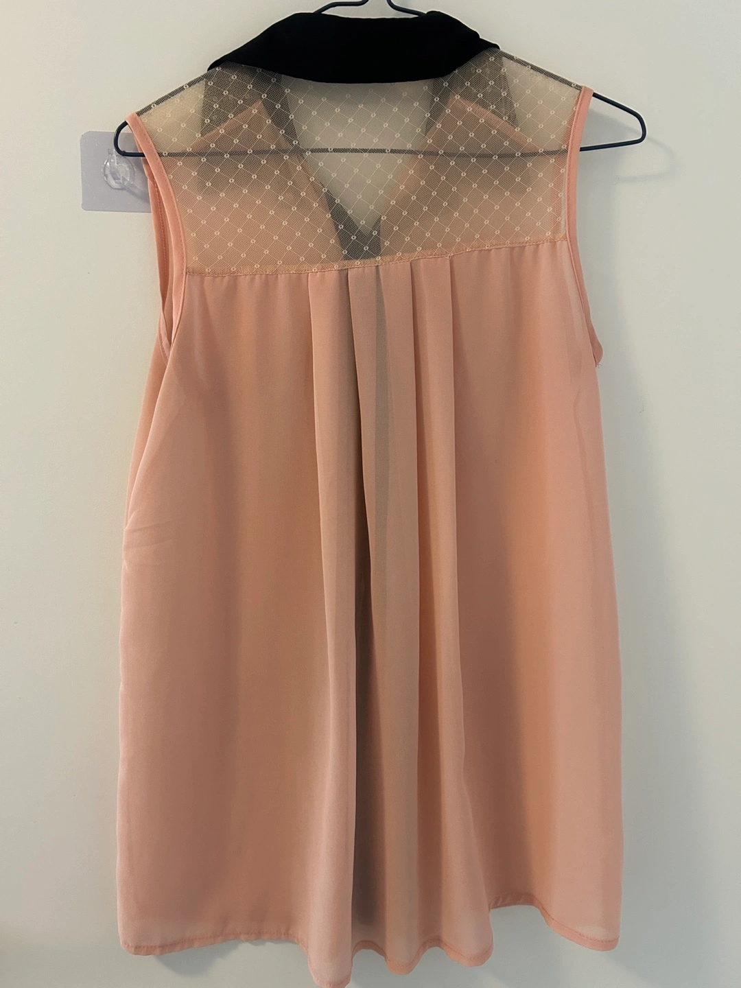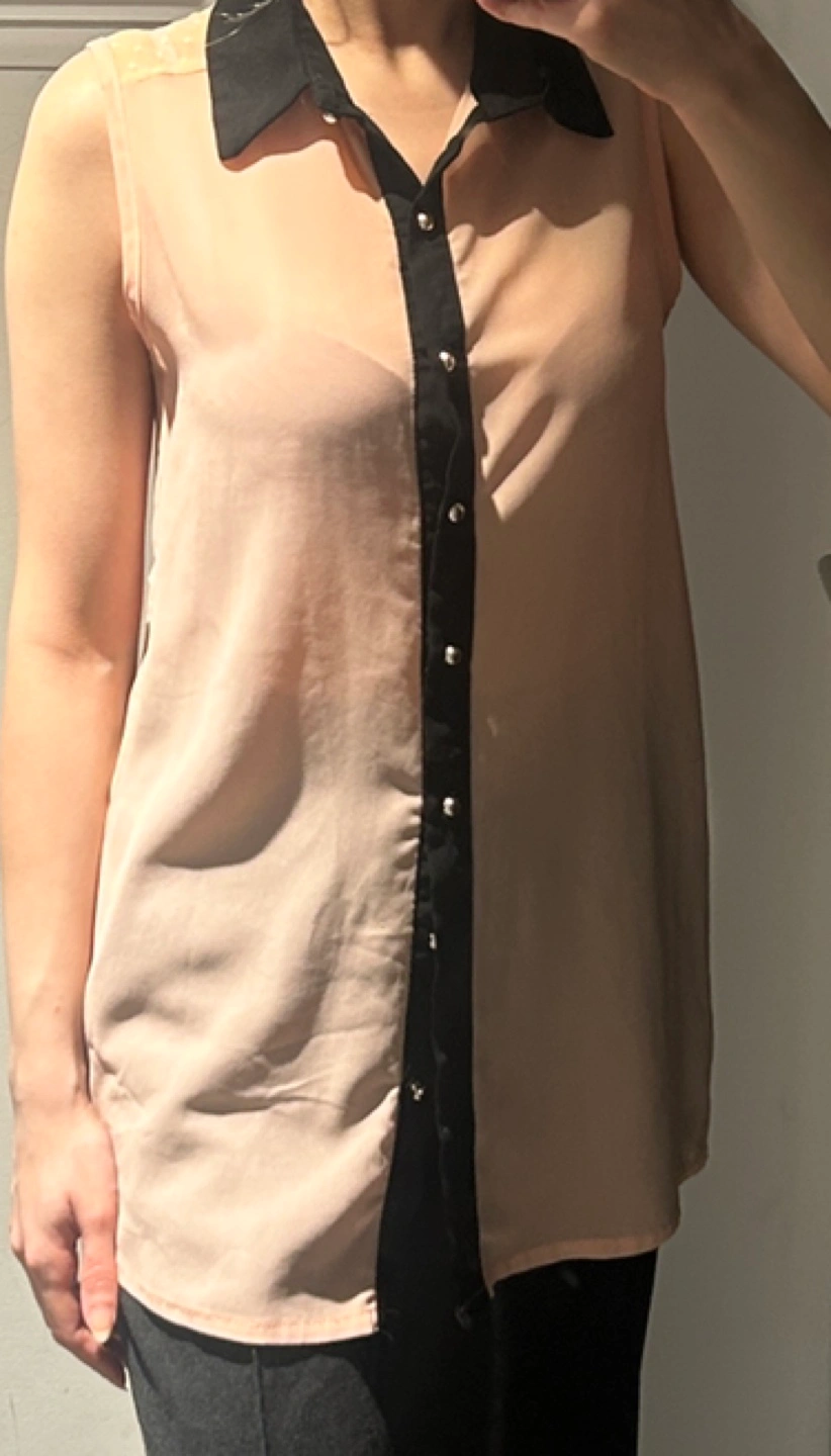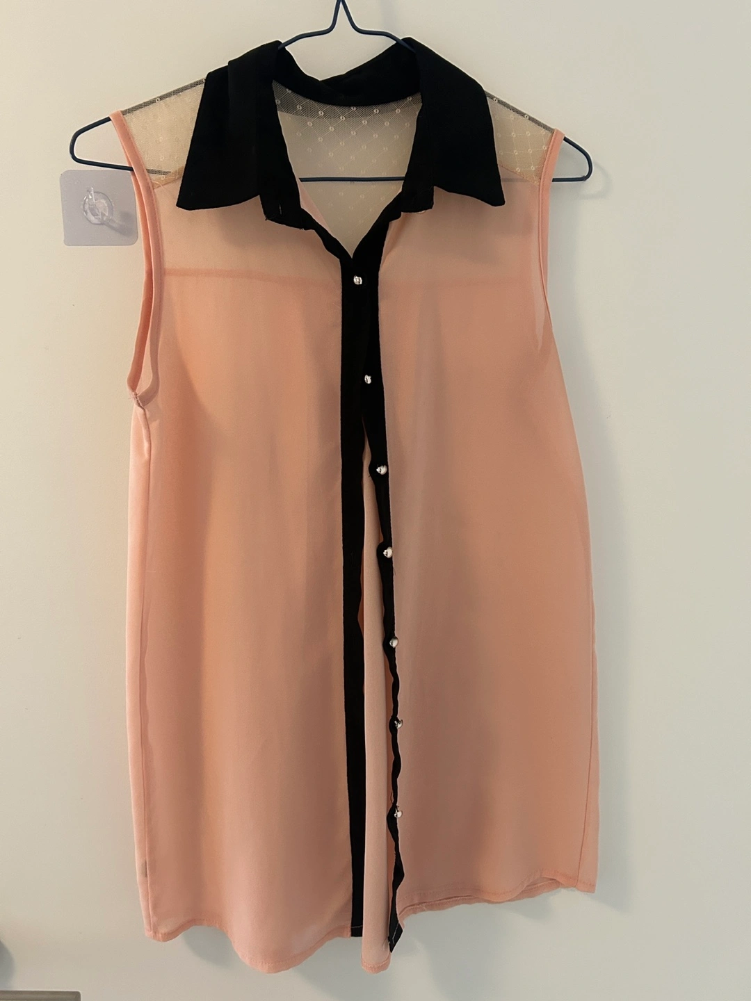 Beautiful sleeveless blouse. Peach coloured top with black collar and sheer yoke. Button front closure. Great for spring or summer.