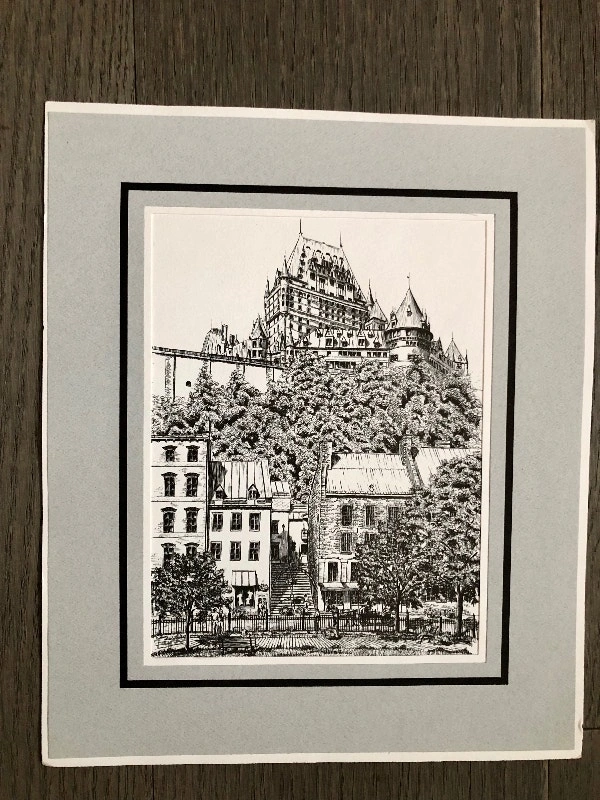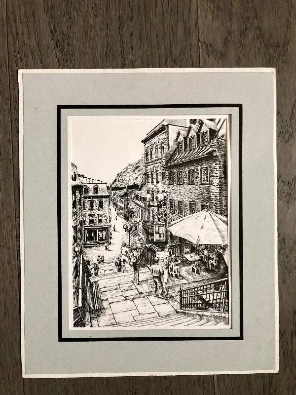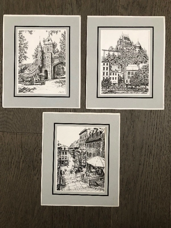 Black and white prints signed by artist Taylor. Features 3 different scenes from Quebec City. Prints are matted for easy framing. Print size is 5.5” x 8”, with matting it's 9” x 10.5”. Pickup in Brampton, near Queen and Kennedy.