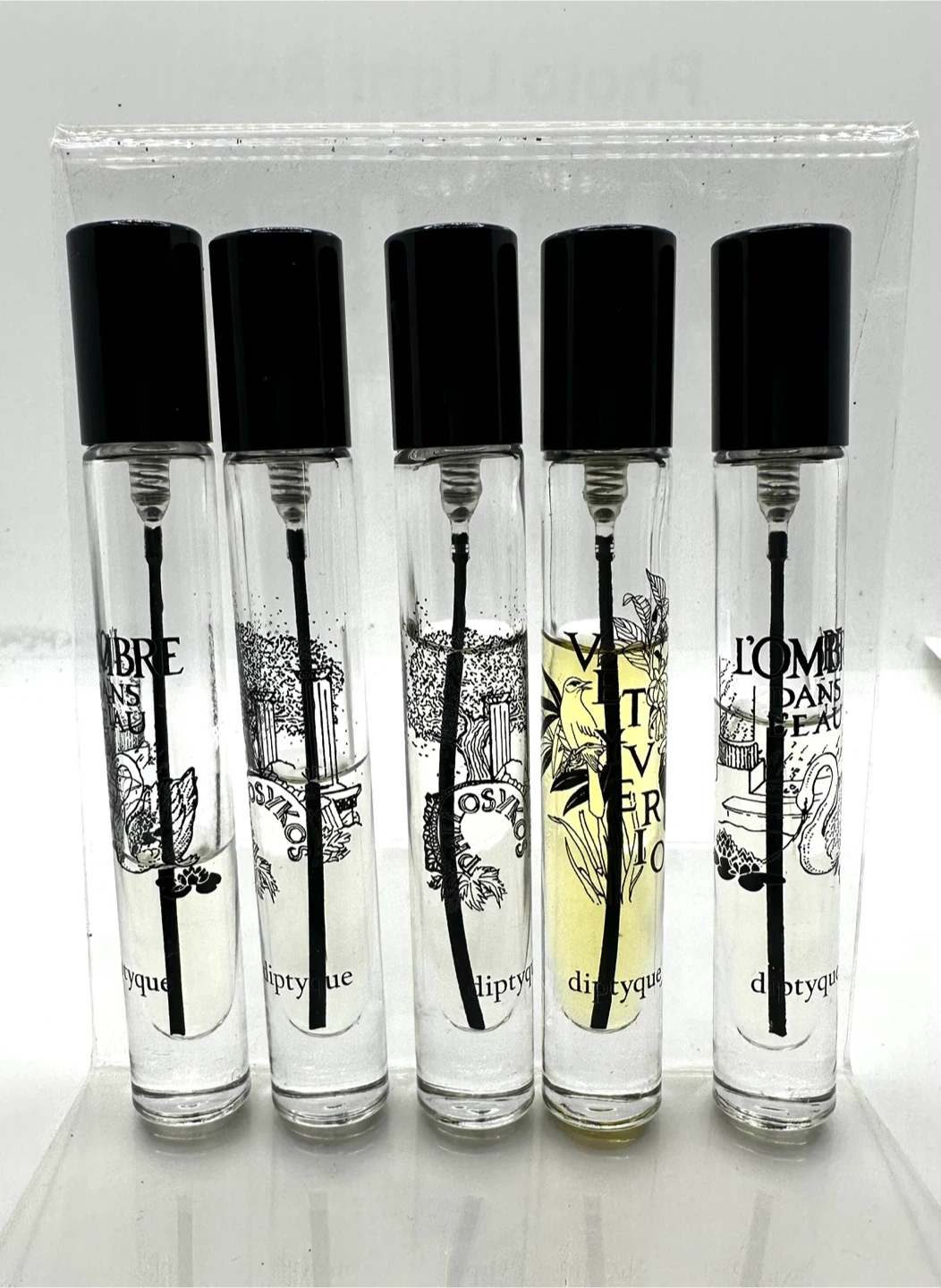 A set of five travel-sized Diptyque perfumes. Each bottle features a unique black and white illustration and a black cap. Includes L'Ombre Dans L'Eau and Eau des Sens.