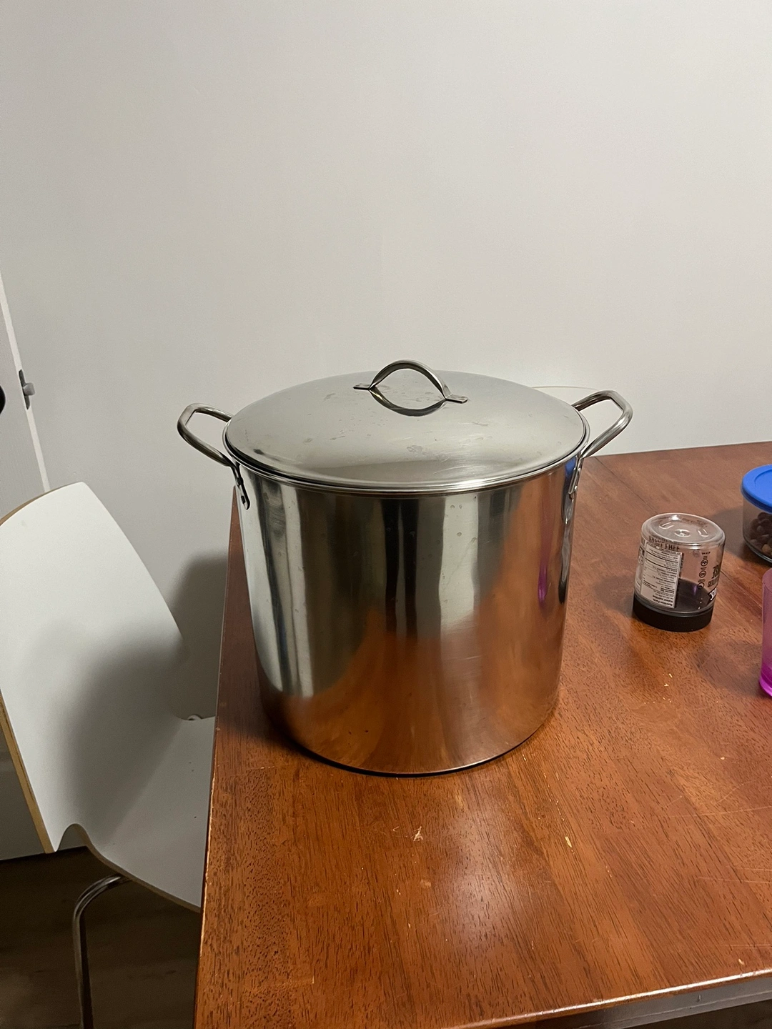 This stock pot is large and has a lid. It is made from stainless steel. It has two handles on the sides.