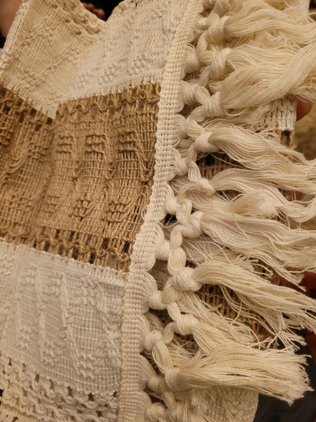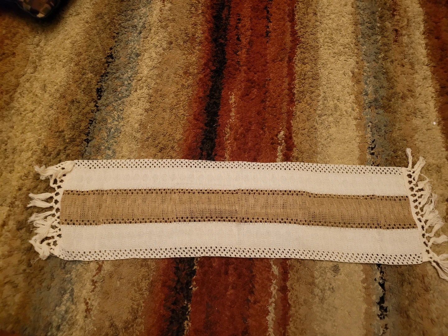 A woven table runner featuring white macrame-style borders and a central section with a natural jute texture. It has white fringe tassels on both ends. This runner adds a touch of rustic charm to your table setting.